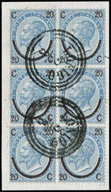 1865 - Kingdom of Italy, 20c on 15c sky blue, third re-engraving, vertical block of six cancelled “LONIGO 2/8' [..]