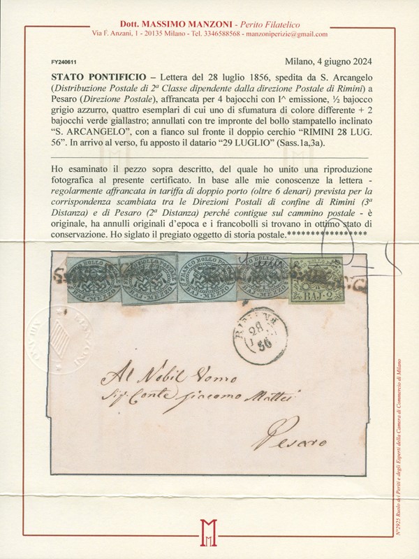 1856 - 1/2 baj grey blue, three copies and a 1/2baj grey, with 2baj yellowish green from 'S. ARCANGELO' to Pesaro. Very interesting rate. Cert. Manzoni (Sassone 1a+3a - Euro -)