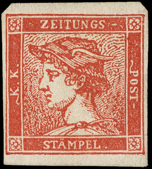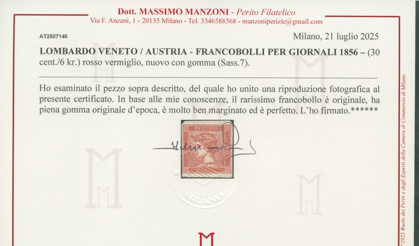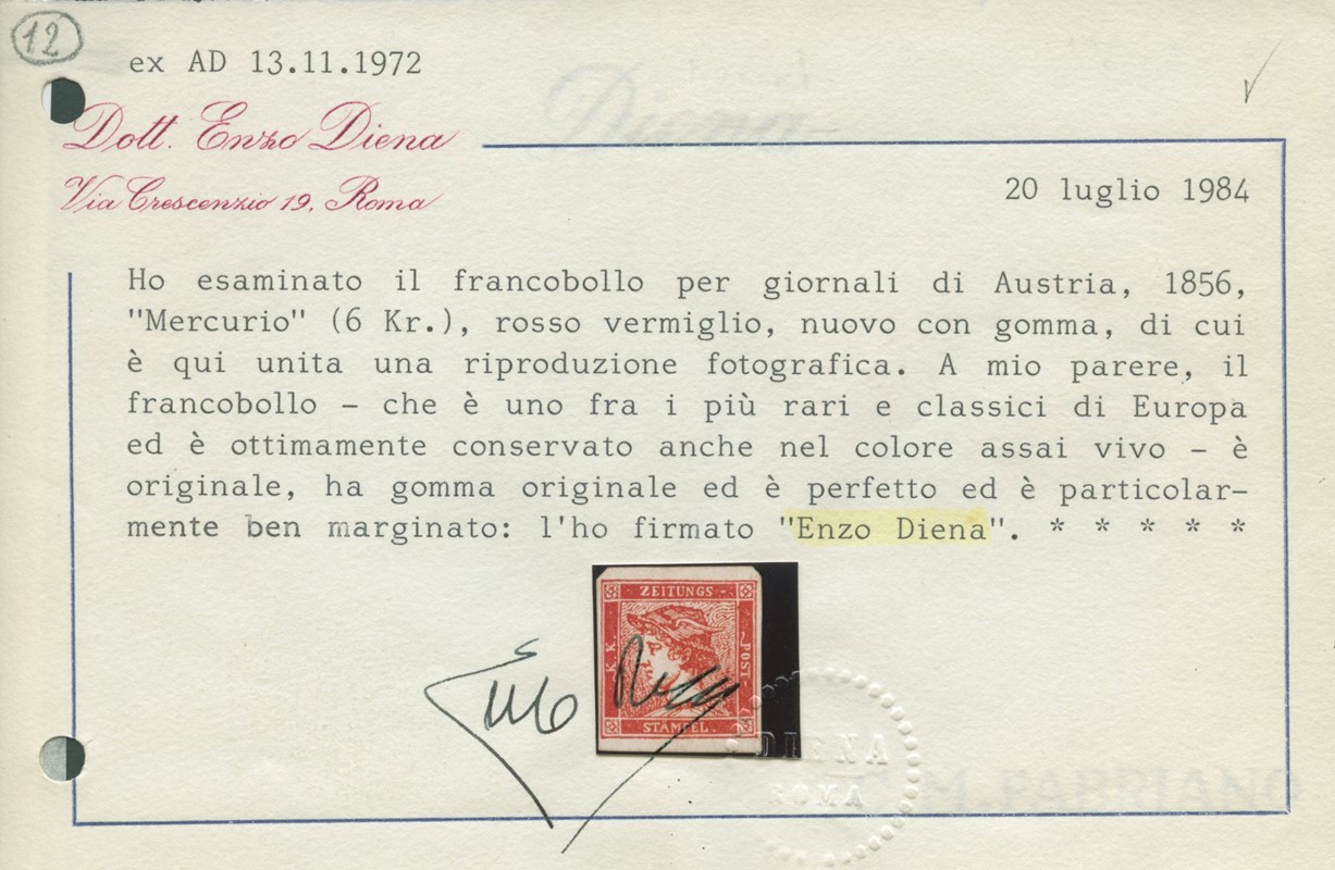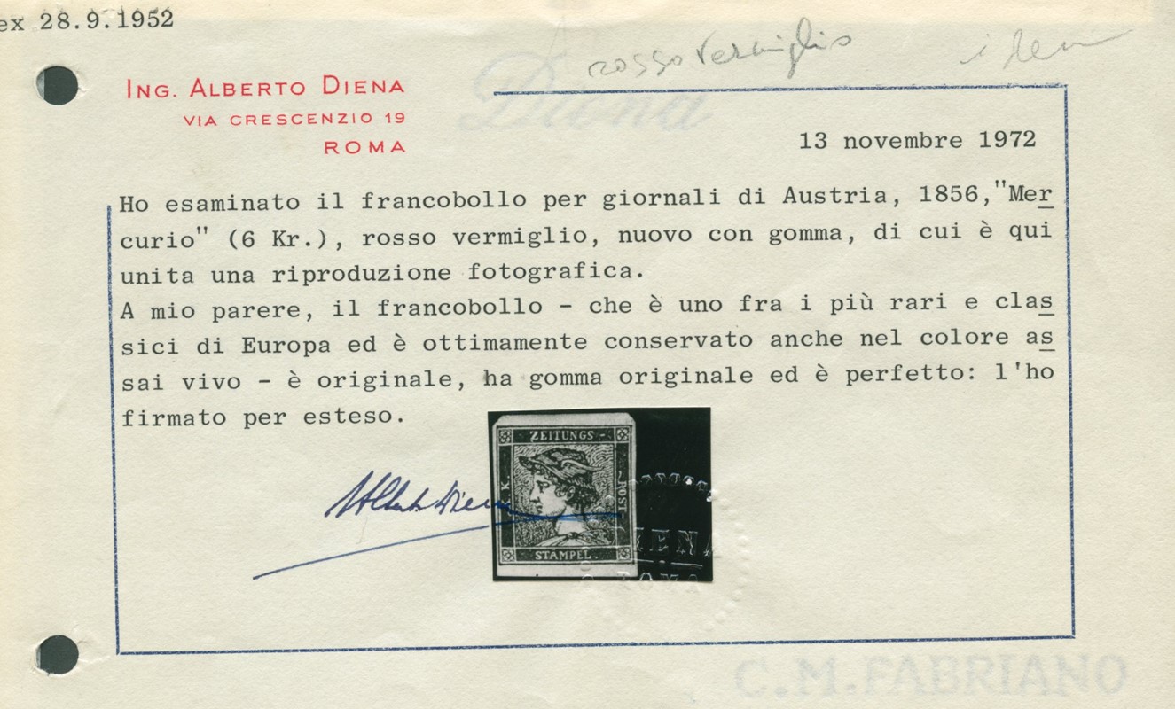 1856 - Mercury (6kr = 30 cent) vermilion-red, 3rd type, with large even margins and full original gum. An outstanding example of this major rarity of Lombardy-Venetia. Signed Em. Diena, certs. Manzoni, Alberto and E.Diena (Sassone FG7 - Euro 360,000)
