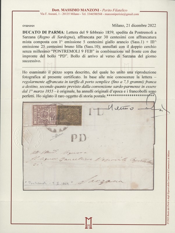 1857 - 5c yellow 1st issue and 25c lilac-brown 3rd issue, from “PONTREMOLI 9 FEB' 1859 (datestamp without year) to Sarzana. Signed Sorani and cert. Manzoni (Sassone 1+10+pt.5 - Euro 4,950+)
