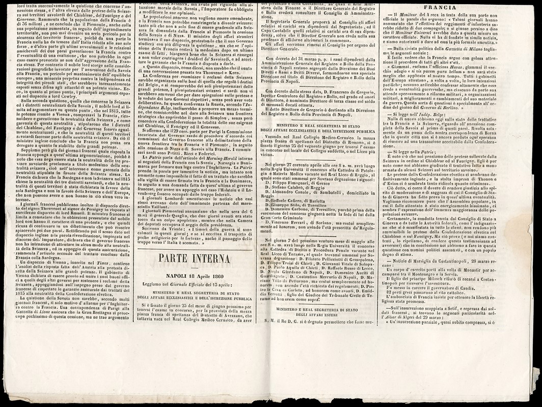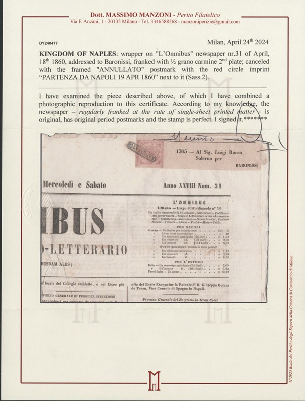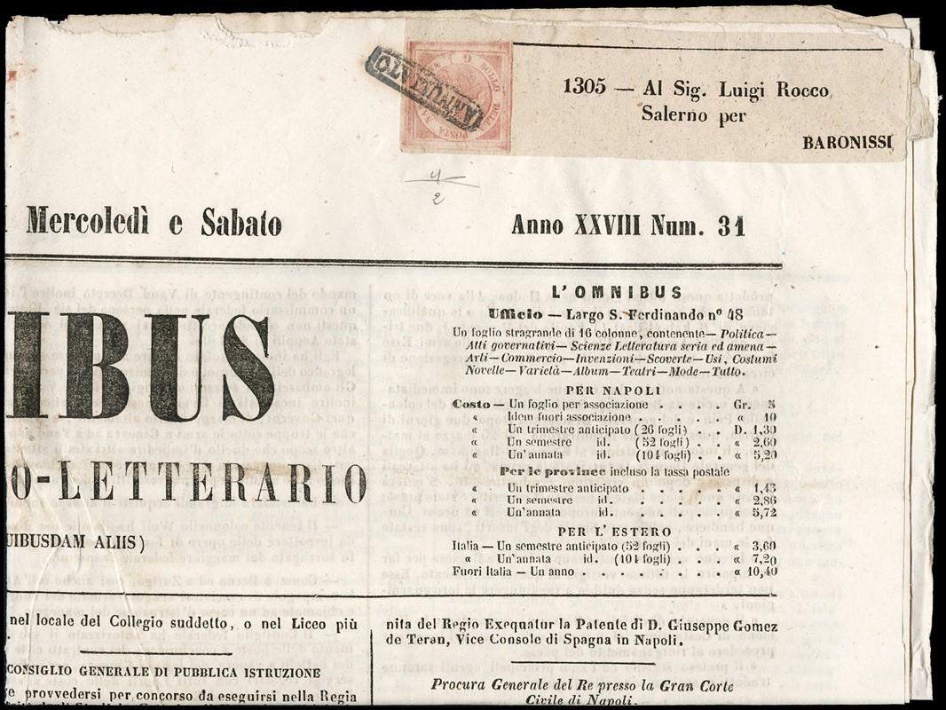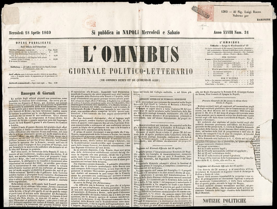 1858 - 1/2 gr carmine, 2nd plate, “ANNULLATO' on newspaper L’OMNIBUS from “PARTENZA DA NAPOLI 19 APR 1860' to Baronissi. Cert. Manzoni (Sassone 2 - Euro 4.500)