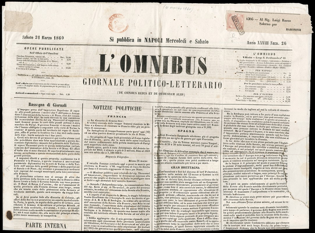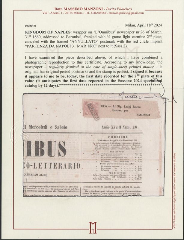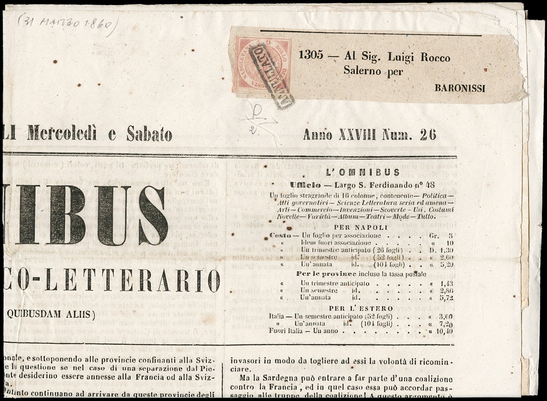 1858 - 1/2 gr carmine, 2nd plate, “ANNULLATO' on newspaper L’OMNIBUS from “PARTENZA DA NAPOLI 31 MAR 1860' to Baronissi. An item of great significance being the earliest recorded date of the 1/2 grano of the 2nd plate, preceding by 12 days the date indicated in the Sassone catalogue (2025 edition). Cert. Manzoni (Sassone 2 - Euro 4.500+++)