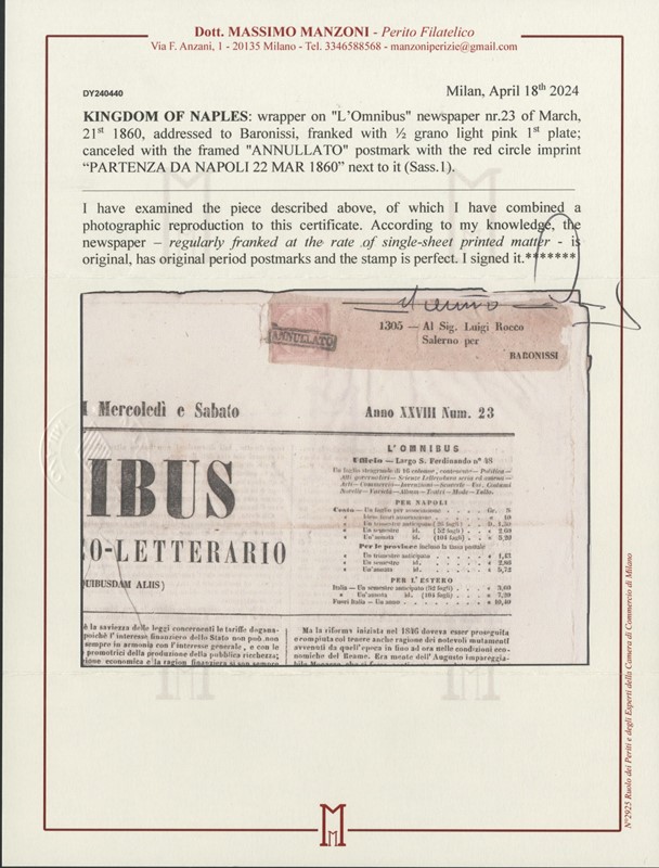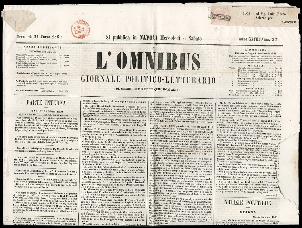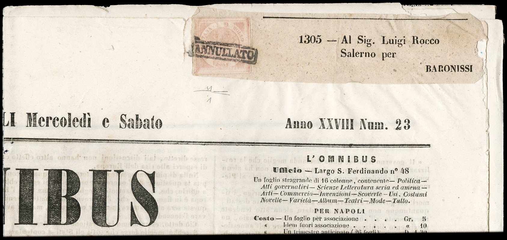 1858 - 1/2 gr light pink, 1st plate, 'ANNULLATO' on the newspaper 'L'OMNIBUS' from 'PARTENZA DA NAPOLI 22 MAR 1860' to Baronissi. Cert. Manzoni (Sassone 1 - Euro 2,700)