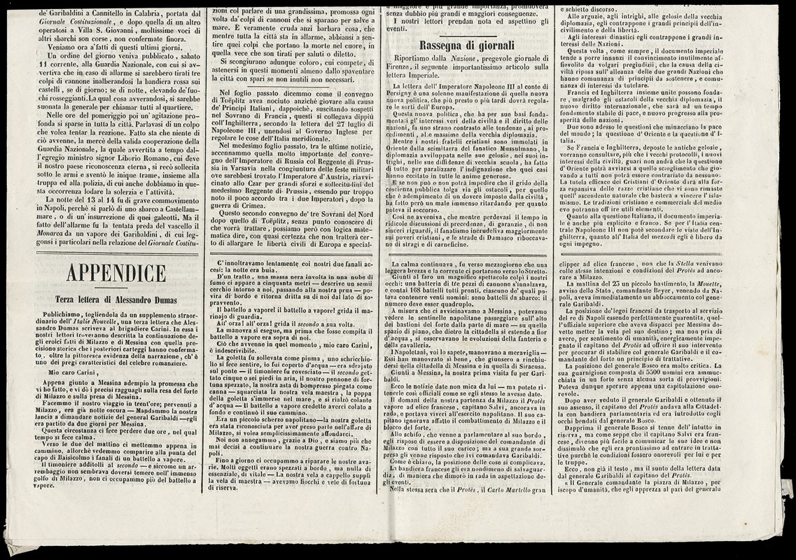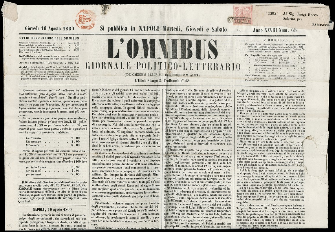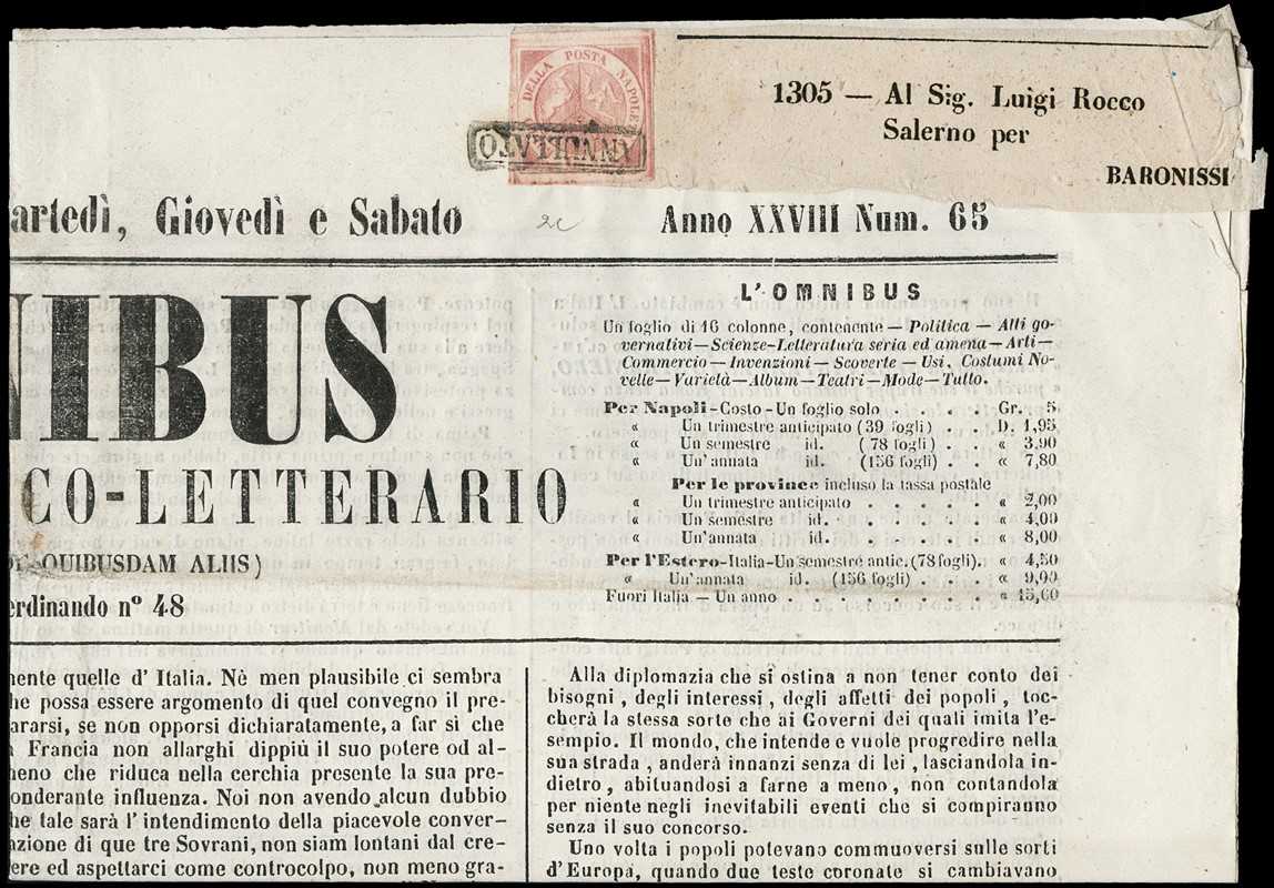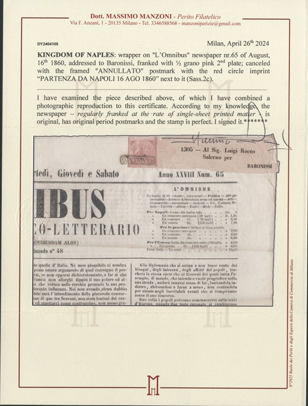 1858 - 1/2 gr rose, 2nd plate, “ANNULLATO' on newspaper L’OMNIBUS from “PARTENZA DA NAPOLI 16 AUG 1860' to Baronissi. Cert. Manzoni (Sassone 2c - Euro 5.775)