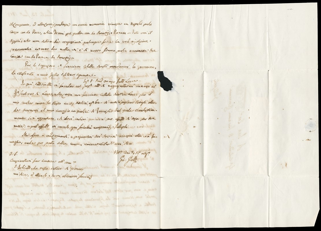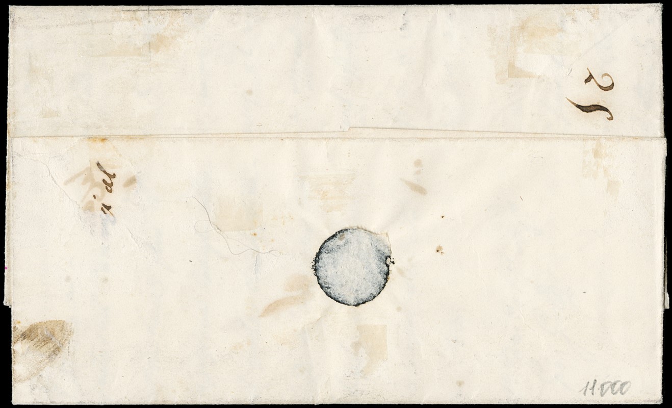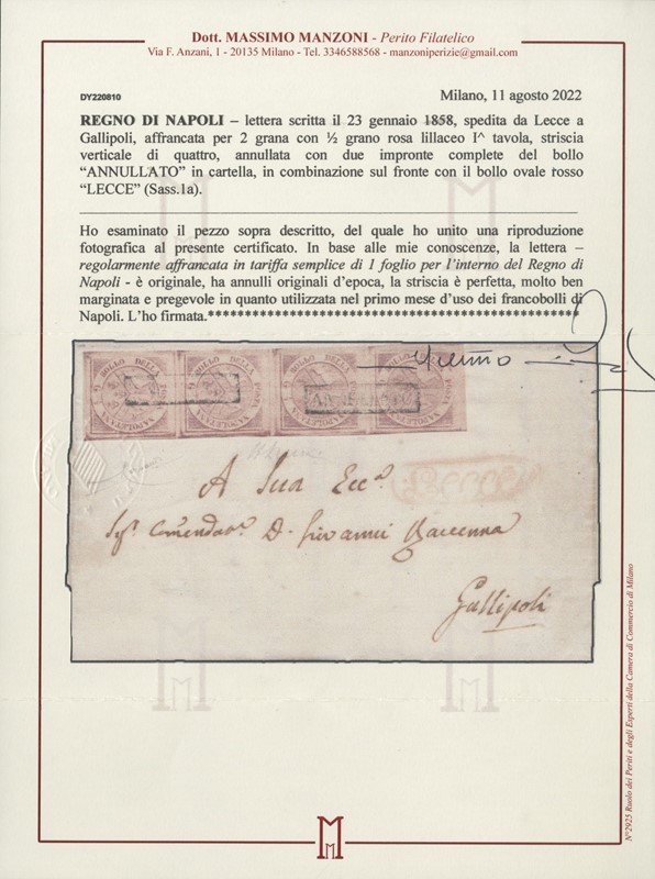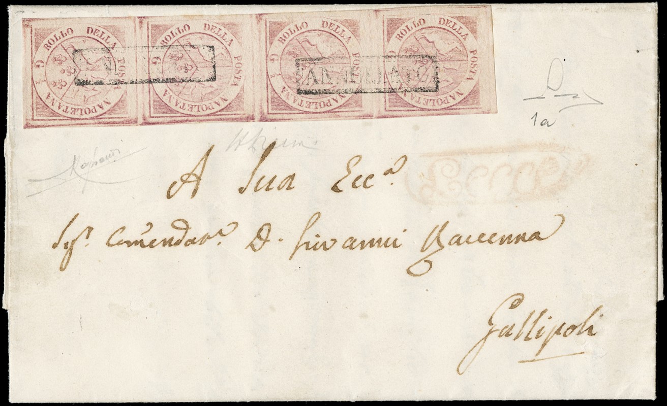 1858 - 1/2 gr lilac-pink, 1st plate, vertical strip of 4, very well margined, 'ANNULLATO' on cover from Lecce to Gallipoli, January 23, 1858. Rare, first month of use of Naples stamps. Signed A.Diena, Luigi Raybaudi, cert. Manzoni (Sassone 1a - Euro 11,000)