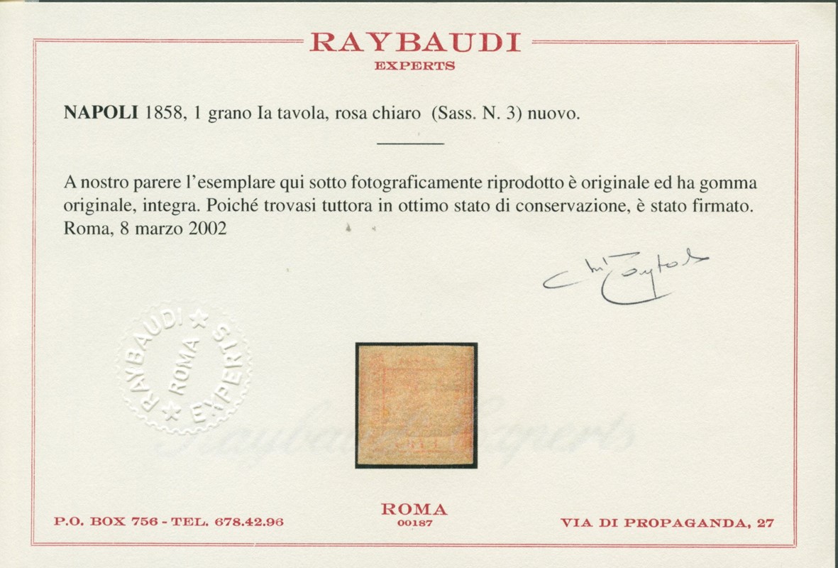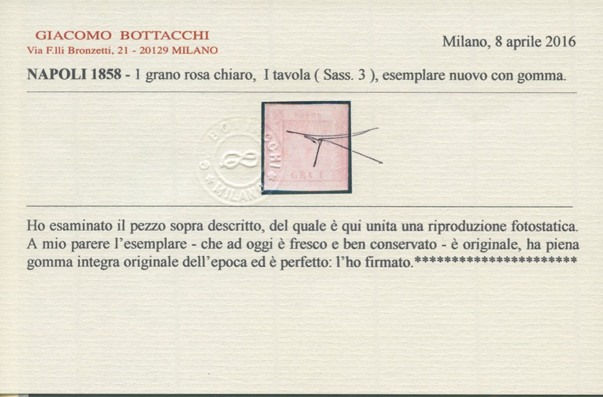 1858 - 1gr light rose, 1st plate, unused without gum. Certs. Bottacchi and Raybaudi (Sassone 3 - Euro 7.000)