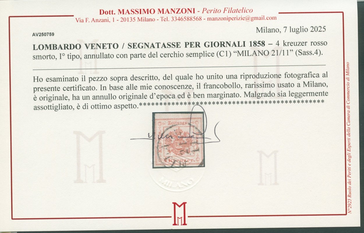 1858 - 4kr dull red, cancelled “MILANO 21/11' (C1). Stamp with small surface scrape but otherwise of fine appearance. Extremely rare used in Milan and Lombardy for 4kr, not yet demonetized to 2kr (Sassone 4 - Euro 32,500)