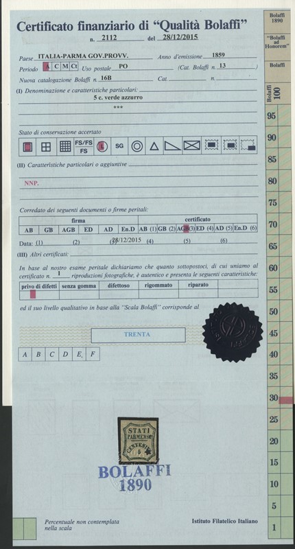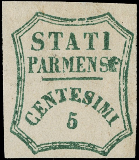 1859 - 5 c blue-green with ink spot on the letter “e' of “Parmensi'. Signed Fiecchi and cert. Bolaffi (Sassone 12 - Euro 7,500+)