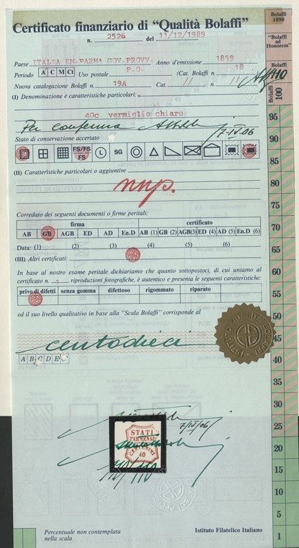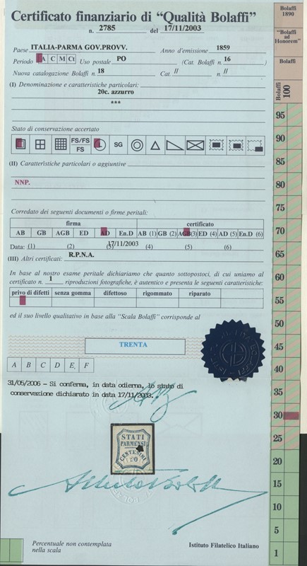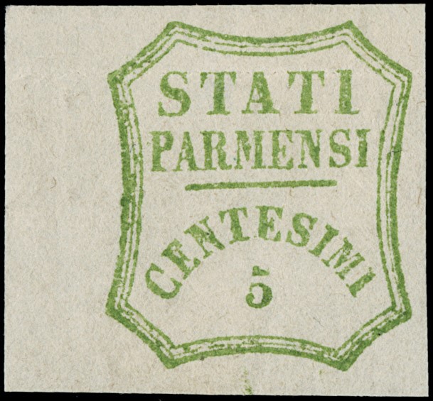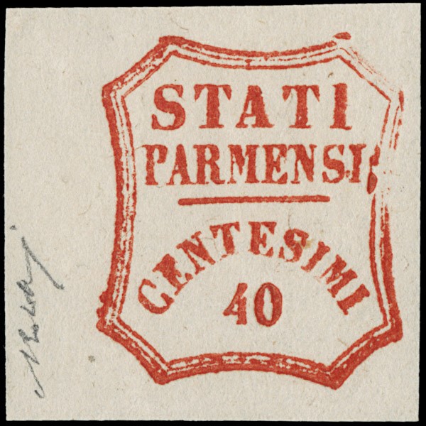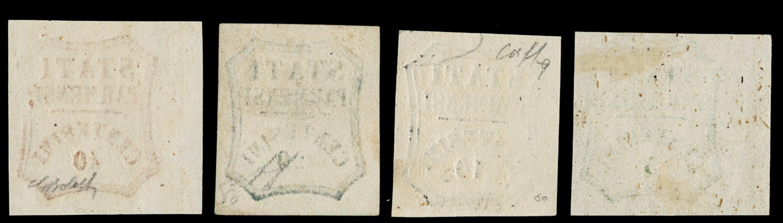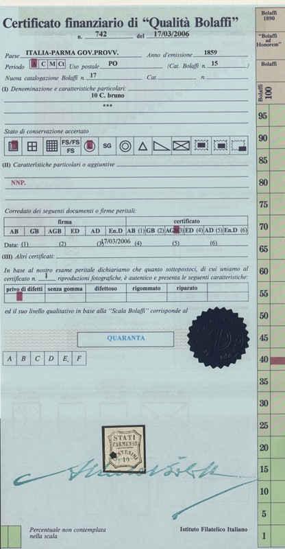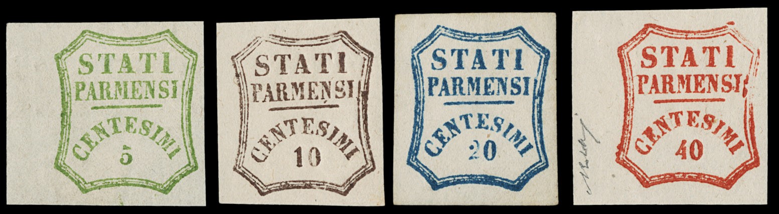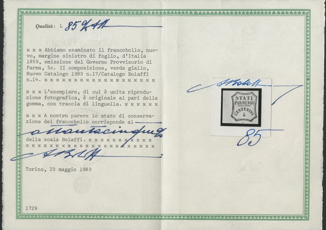 1859 - 5 c yellow-green sheet border, 10c brown, 20c blue and 40c vermilion sheet border, mint with gum, the 40c showing MNH Signed Colla on the 10c and A.Diena on the 15 c, cert. Bolaffi for all (Sassone 13/15 tl + 17 sl - Euro 7,900)