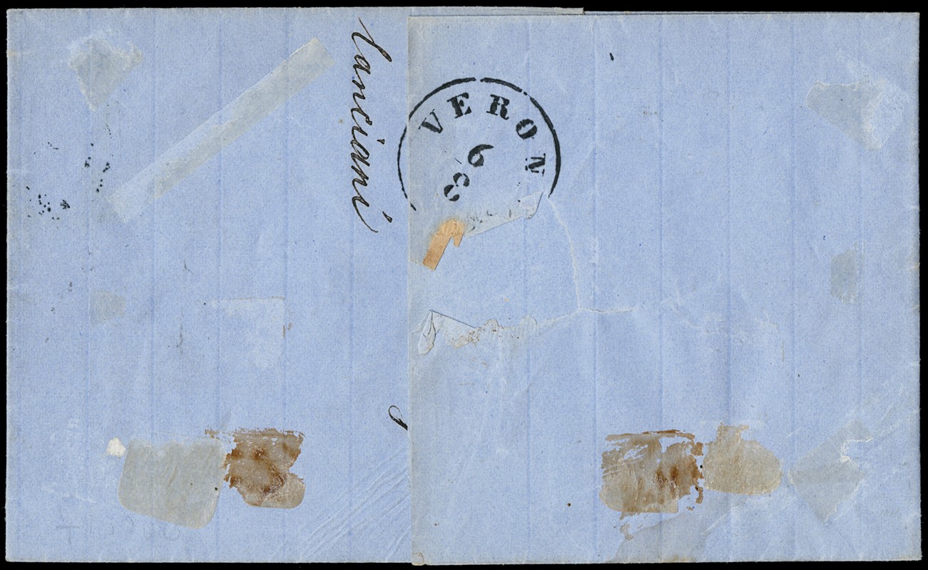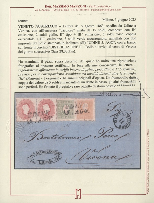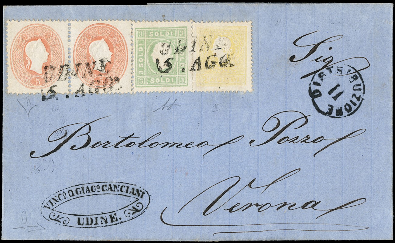 1859 - 2nd issue 2s yellow, 2nd type, with 3rd issue 5s light red (pair, the first stamp with a short lower tooth) and 3s yellow-green, from 'UDINE 5 AUG' 1863 to Verona. Splendid and rare tricolour franking. Initials A.Diena, signed E.Diena and Cert. Manzoni (Sassone 28+33+35 - Euro -)