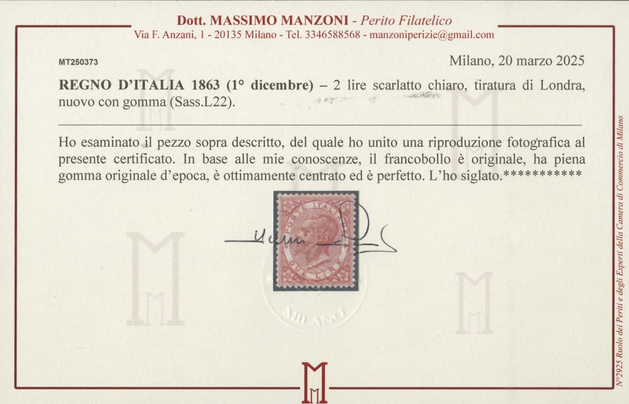 1863 - 2L light scarlet, De La Rue London, excellent centering, unused. Signed A.Diena, cert. Manzoni (Sassone L22 - Euro 2,100+)