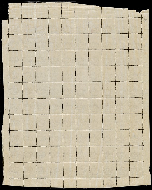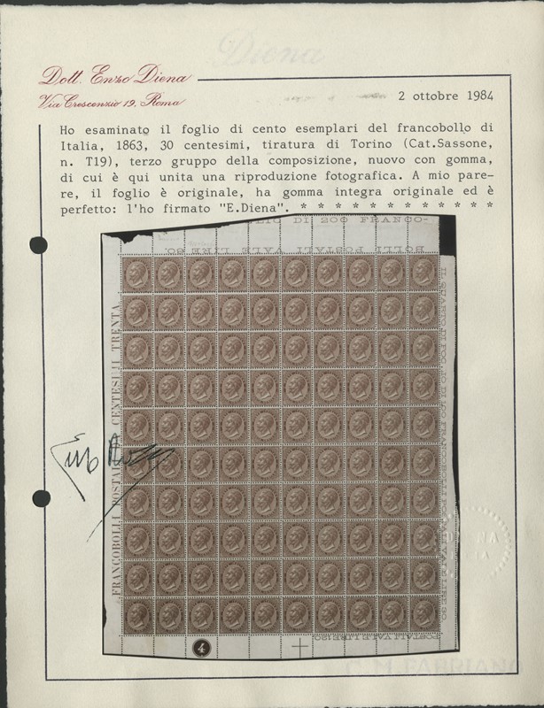 863 - 30c nut-brown, De La Rue Turin, complete sheet of 100 copies with plate number “4' in circle. fine centering, rare. Cert. E.Diena (Sassone T19 - Euro 5,000+)