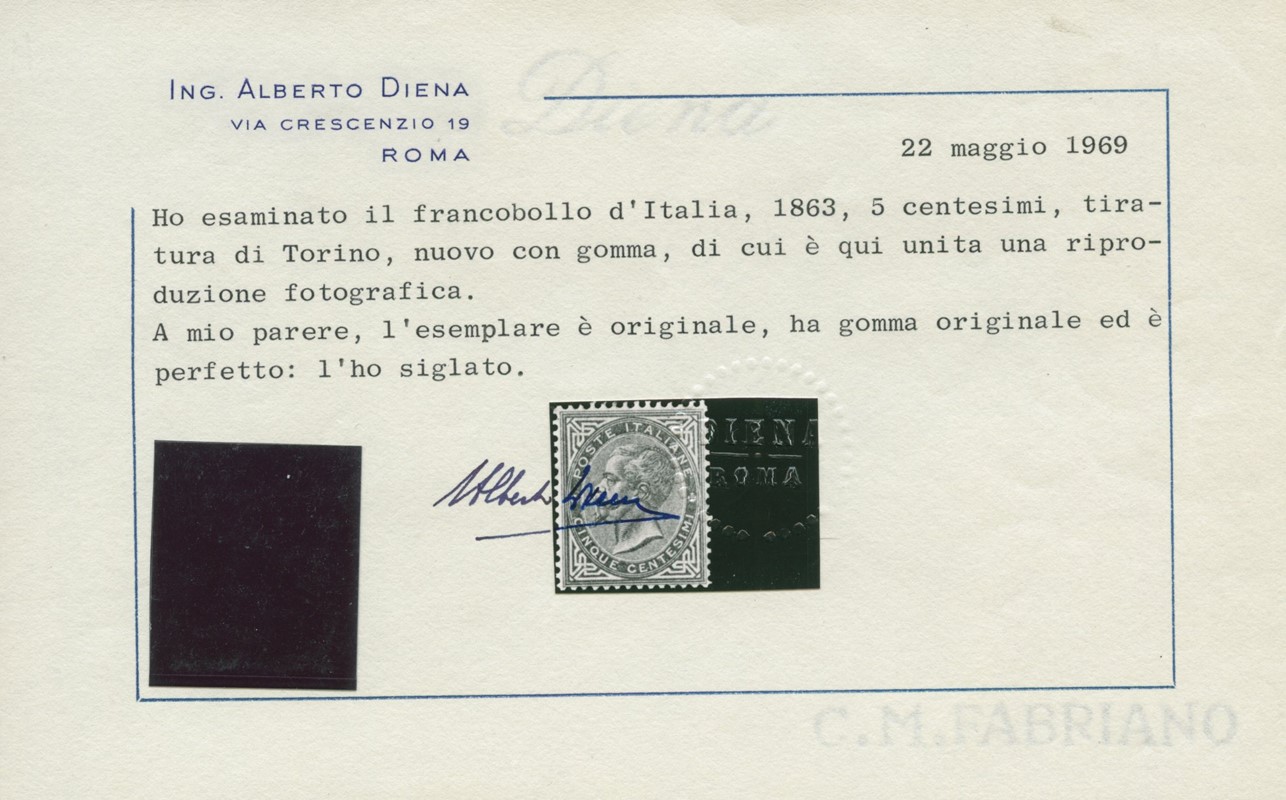 1863 - 5c dark grey-green, De La Rue Turin, well centered, very light hinge. Certs. A.Diena and Zanaria (Sassone T16 - Euro 10,000)