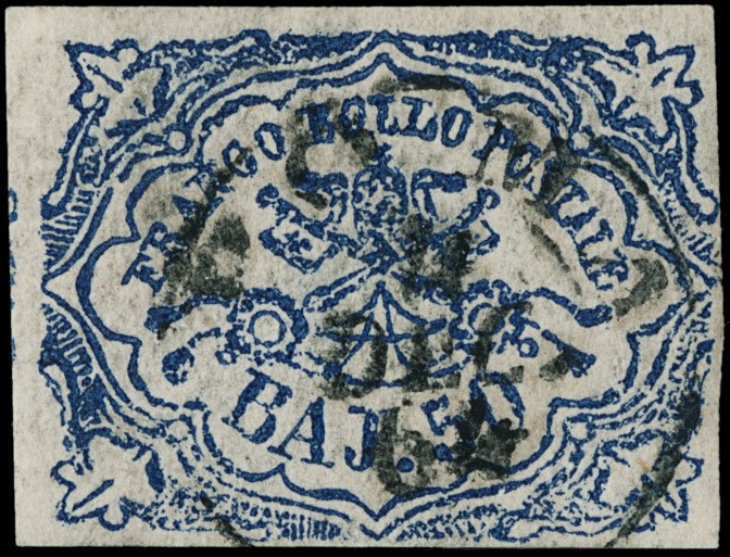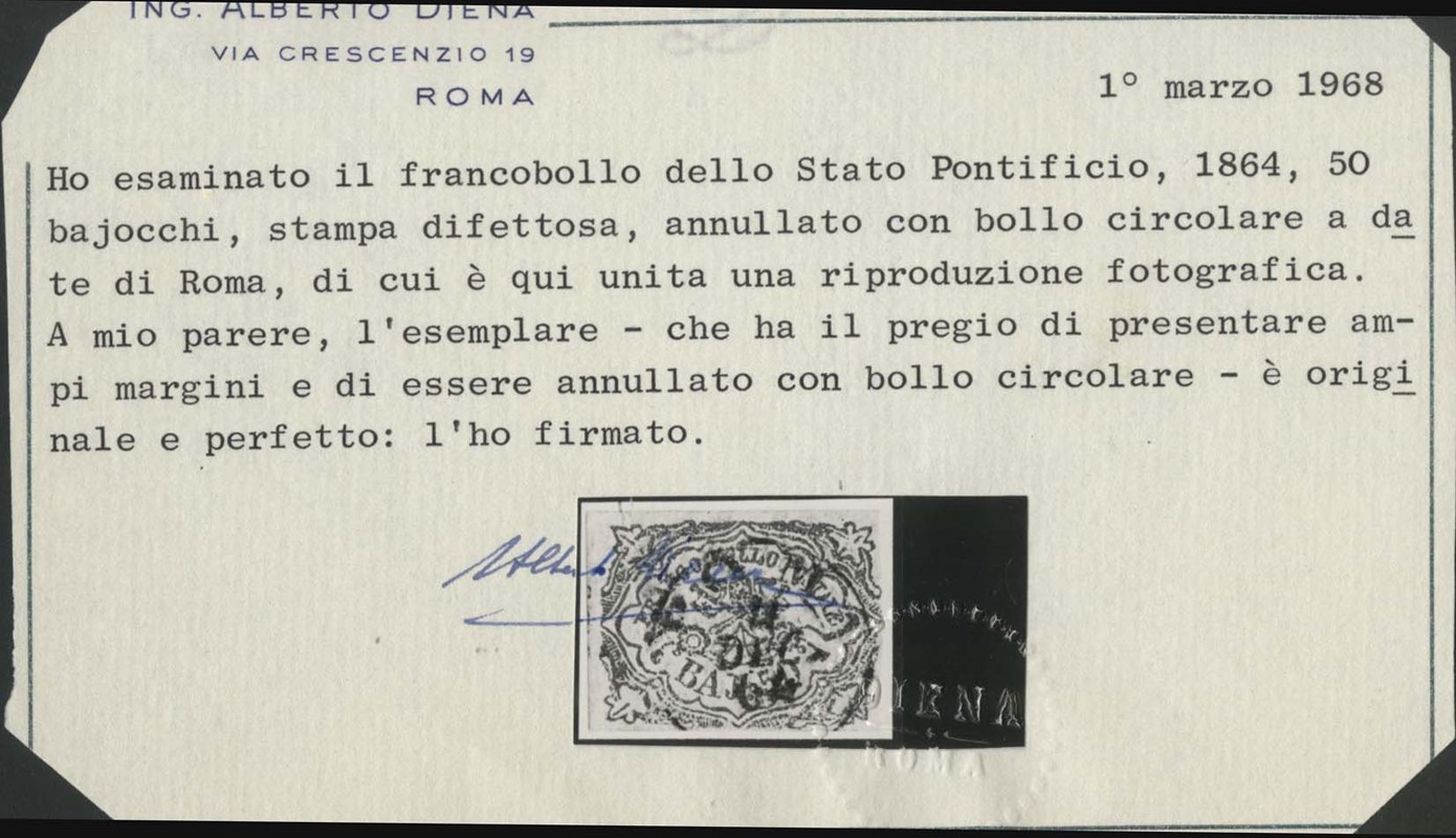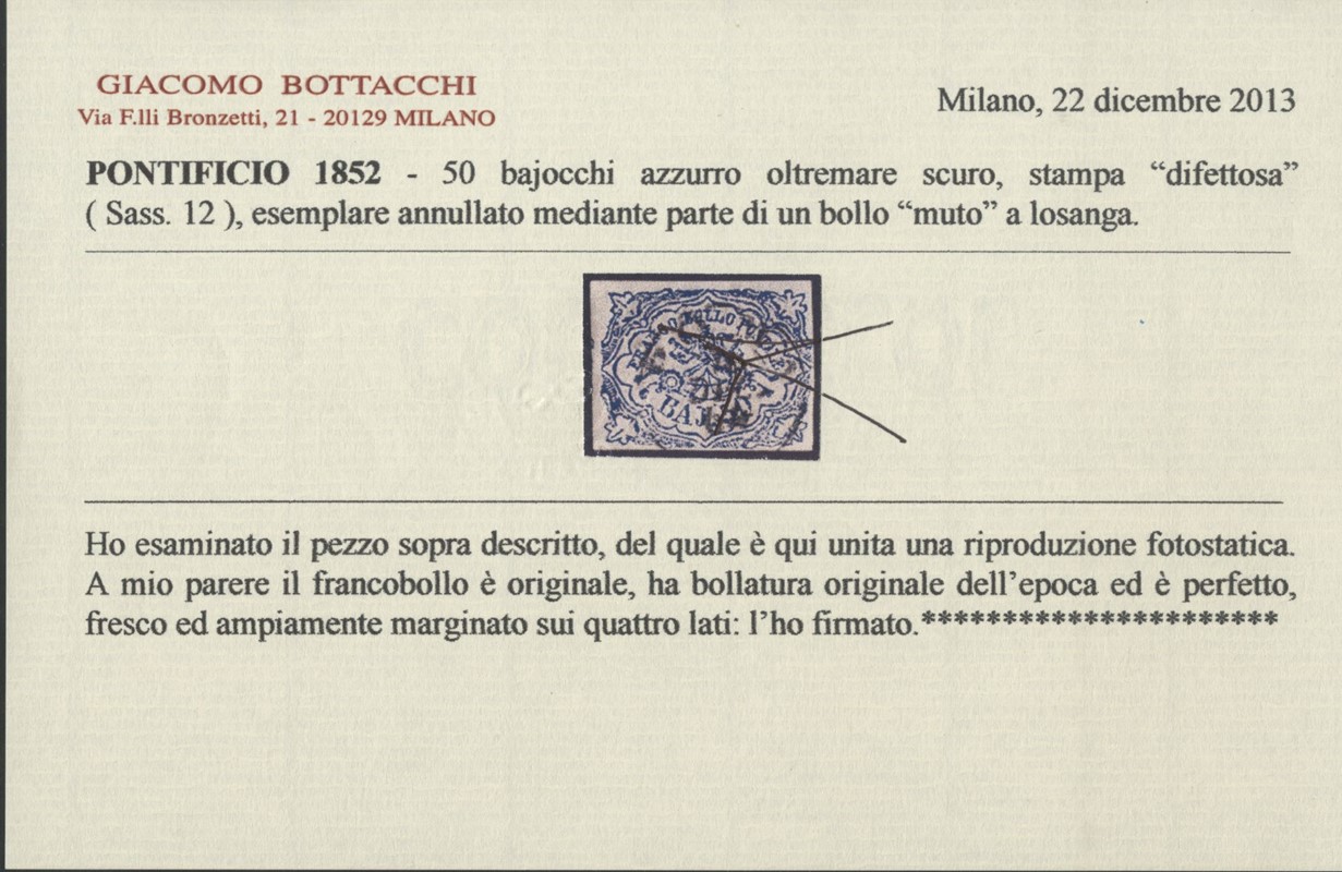 1864 - 50b dark ultramarine, defective printing, cancelled with circular postmark of Roma. Certs. A.Diena and Bottacchi (Sassone 12 - Euro 11,000)