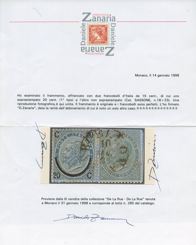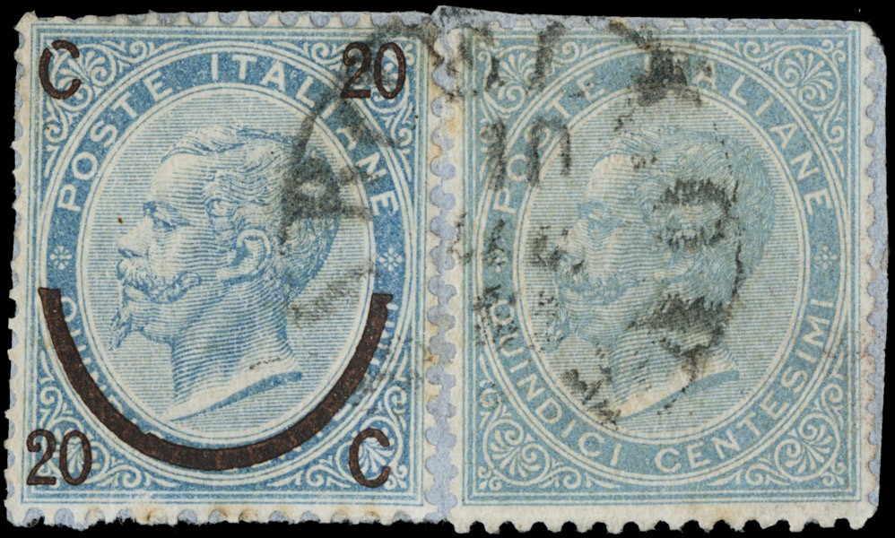 1865 - 15c light sky-blue, De La Rue London, and 20c on 15c light sky-blue, 1st type horse-shoe surcharge, on piece cancelled with Sardinian-Italian circular handstamp of Sicily. Extremely rare mixed issue franking, only two cases recorded. Cert. Daniele Zanaria (Sassone L18+23 - Euro -)
