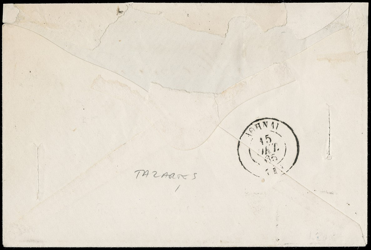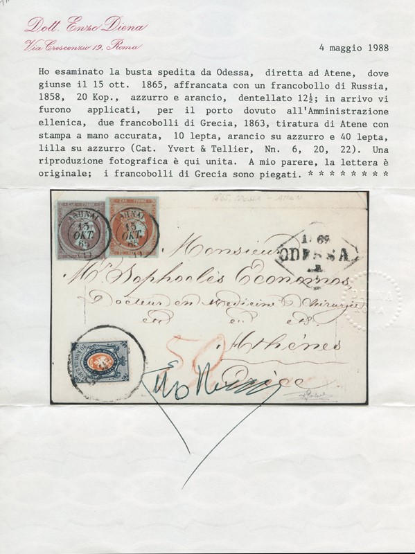 1865 - Large Hermes Heads: Russia 20 kopeks blue and orange, perf. 12 1/2, 1858 (Yvert 6) canceled circular FRANCO, from ODESSA to 'ATHINAI 15.10.65', taxed upon arrival for 50 lepta, with Athens Consecutive printings 1862/67 10 lepta red-range on blue and 40 lepta light mauve on blue (lower right corner cut-in). Disinfected in Piraeus with 2 vertical slits, very interesting. Cert E.Diena (Yvert Russia 6 + Grecia 20a+22 / Hellas 18e+20I)