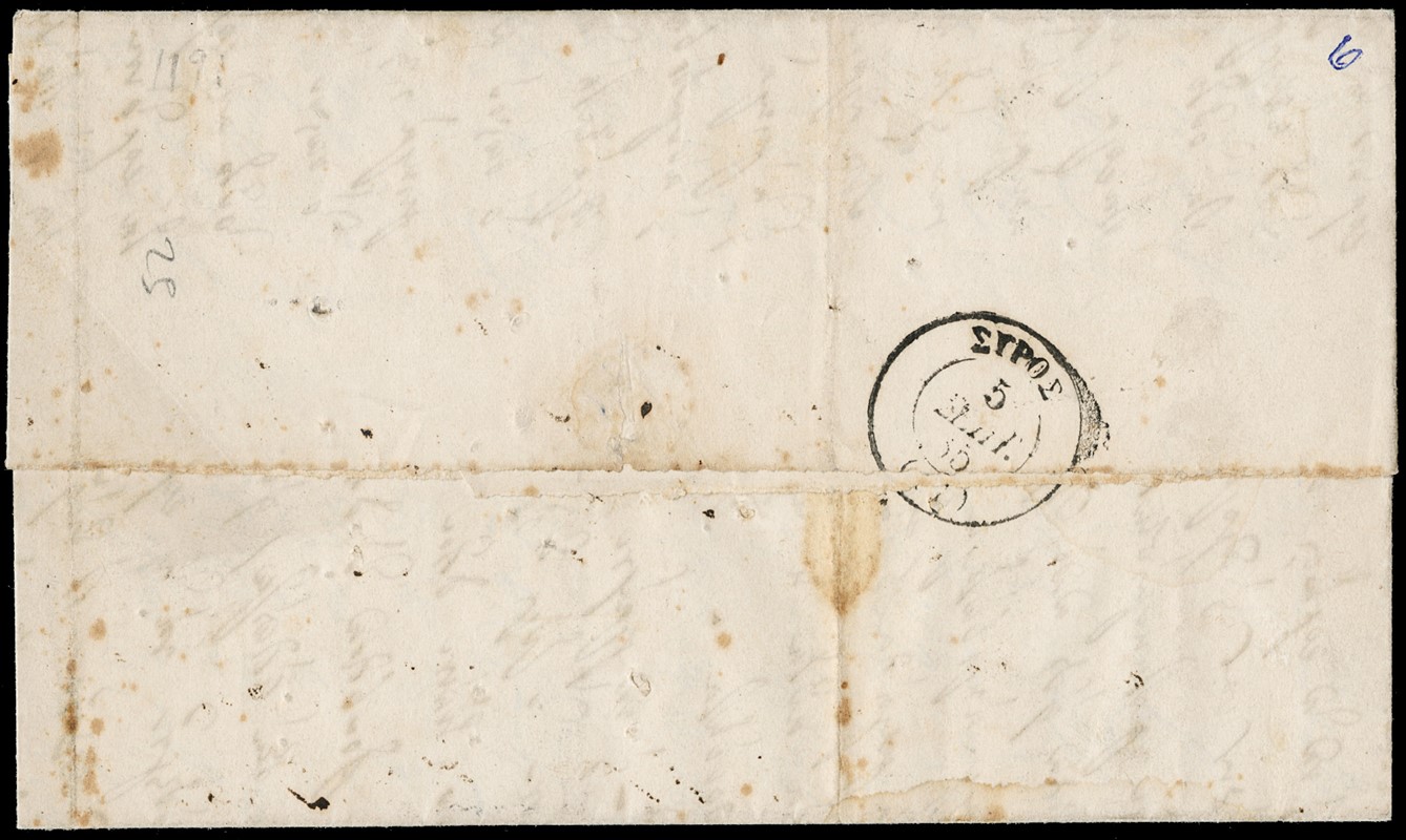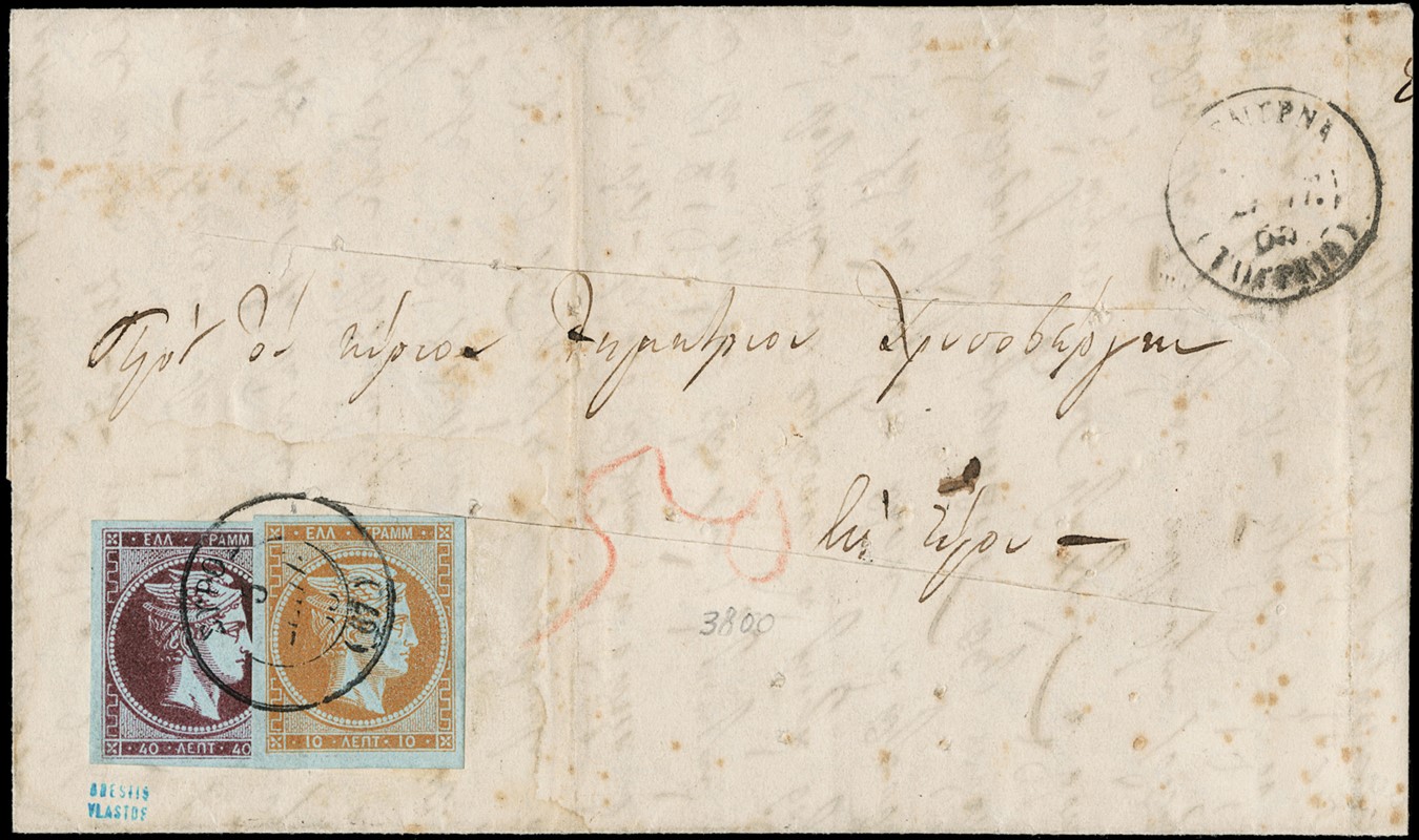 1865 - Large Hermes Heads, Smyrna in Turkiye: letter from 'SMYRNA TURKIYE (04).09.65', not prepaid, to Siros, with Athens consecutive printings 1862/67, 10 lepta yellow-orange and 40 lepta “groseille' canceled 'SYROS 05.09.65'. Letter disinfected upon arrival with two horizontal slits (Yvert 20+22 / Hellas 18+20If)