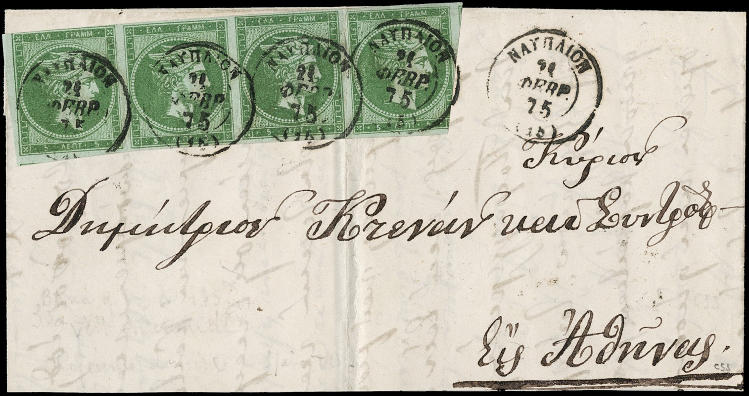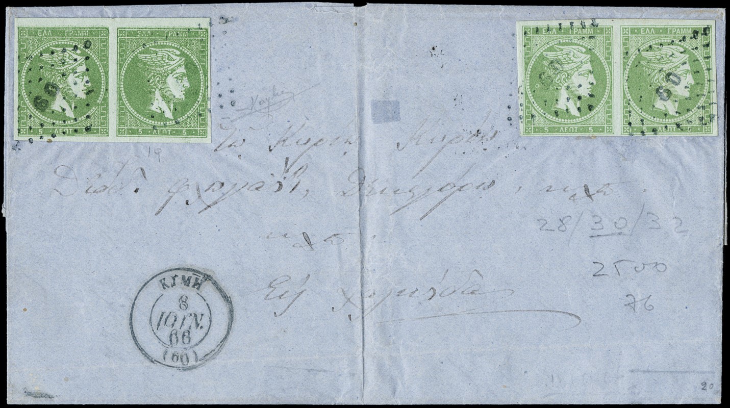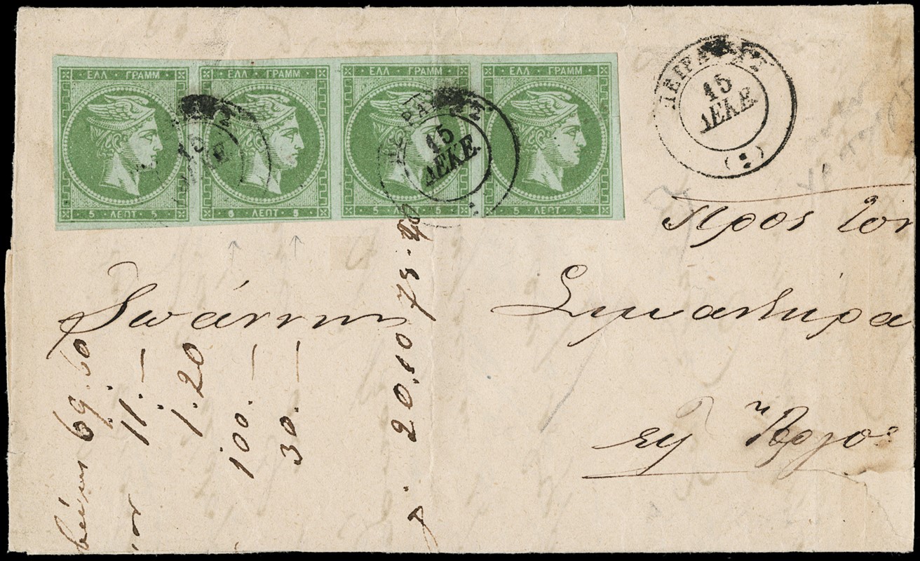1866/79 - Large Hermes Heads, four letters franked for 20 leptas with different combination and printings of green 5 lepta: -1. 5 lepta 1862-67, two pairs canceled dotted '60' from 'KYMI 08.06.66' (Yvert 19 / Hellas 17); -2. 5 lepta 1871-72, strip of four (two with short bottom margins) from 'PIRAIEFS 15.12.72' (Yvert - / Hellas 34); -3.5 lepta 1875-80 meshed paper, strip of four (defective) from 'NAFPLION 21.02.75' (Yvert 35 / Hellas 39); -4. 5 lepta cream paper 1875-80, two pairs (one defective) from 'LEVADIA 20.10.79' in blue (Yvert 43 / Hellas 49)