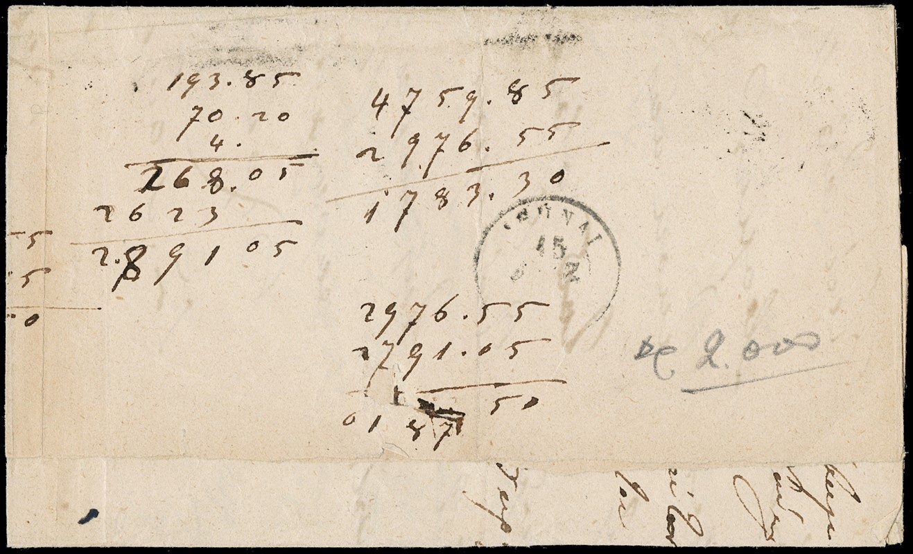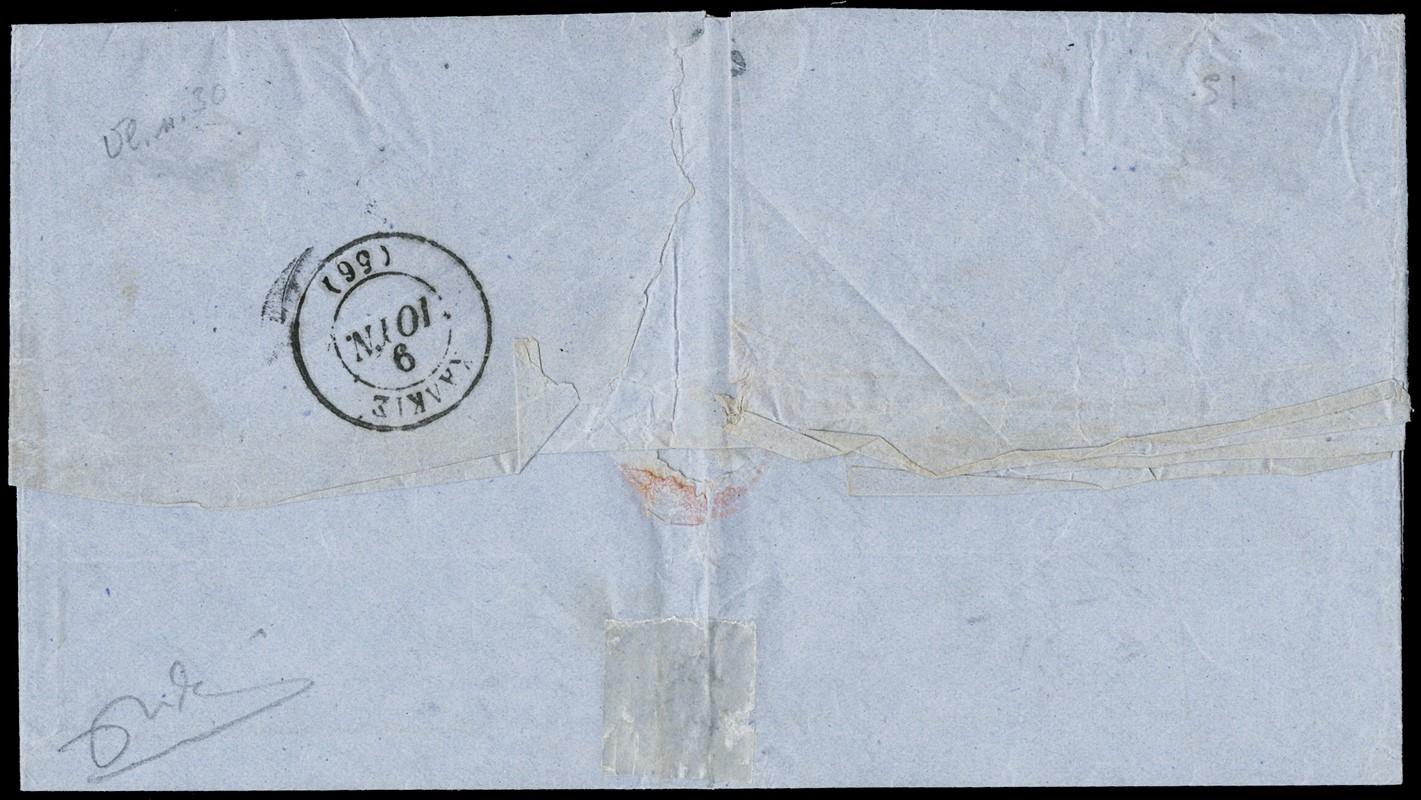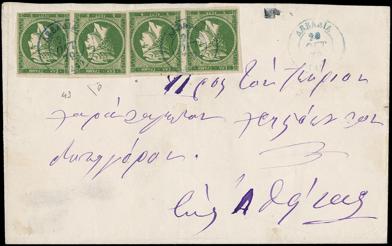 1866/79 - Large Hermes Heads, four letters franked for 20 leptas with different combination and printings of green 5 lepta: -1. 5 lepta 1862-67, two pairs canceled dotted '60' from 'KYMI 08.06.66' (Yvert 19 / Hellas 17); -2. 5 lepta 1871-72, strip of four (two with short bottom margins) from 'PIRAIEFS 15.12.72' (Yvert - / Hellas 34); -3.5 lepta 1875-80 meshed paper, strip of four (defective) from 'NAFPLION 21.02.75' (Yvert 35 / Hellas 39); -4. 5 lepta cream paper 1875-80, two pairs (one defective) from 'LEVADIA 20.10.79' in blue (Yvert 43 / Hellas 49)