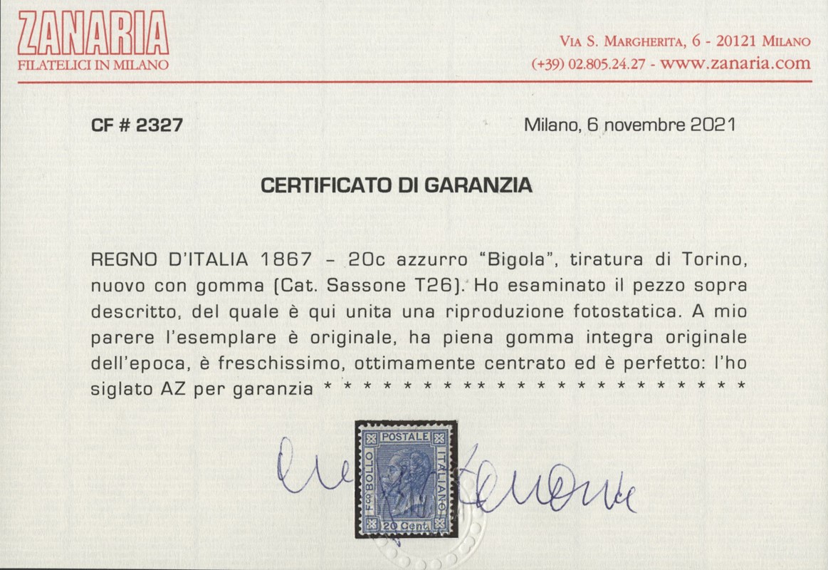 1867 - 20c blue, “Bigola', fine centering, MNH. Cert. Zanaria (Sassone T26 - Euro 2,200)