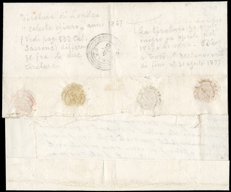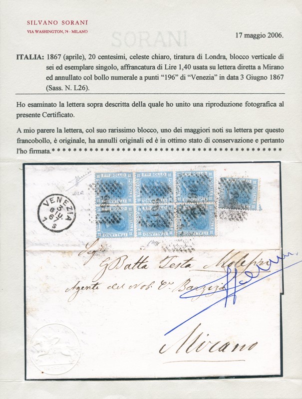 1867 - 20c light blue, “Bigola' London printing, vertical BL6 and single, cancelled with dotted numeral “196' from “VENEZIA 3 GIU. 67' to Mirano. Very rare franking, one of the largest known blocks of this denomination on cover. Cert. Sorani (Sassone L26 - Euro 15,000+)