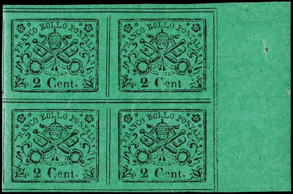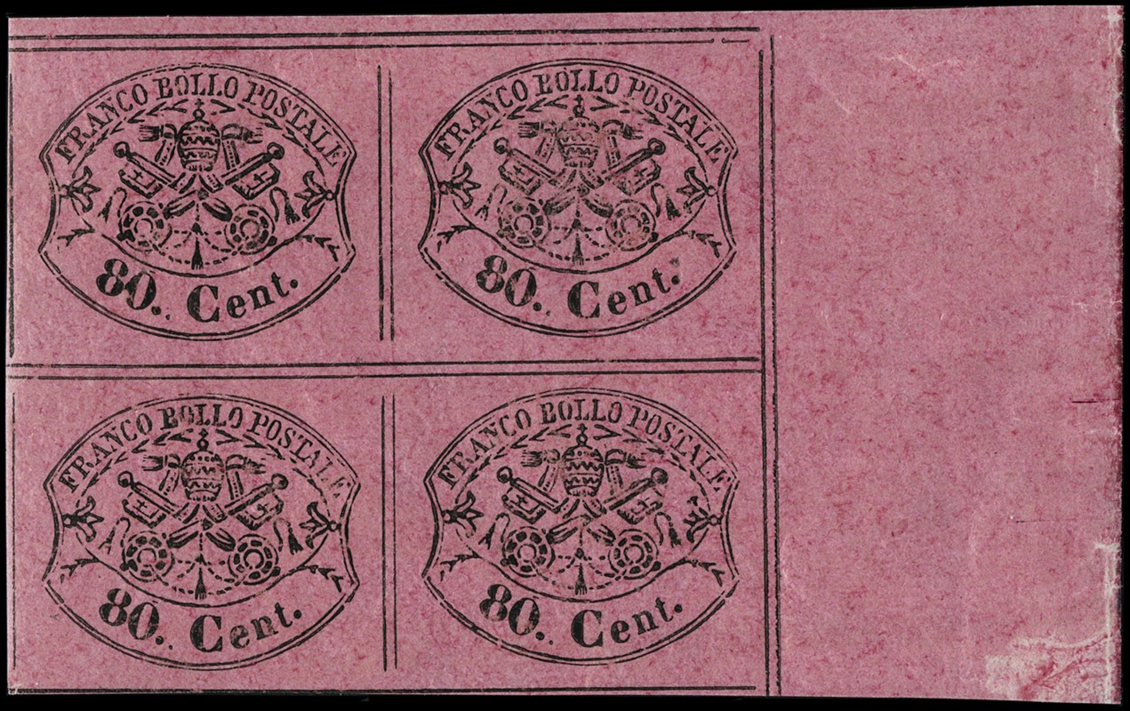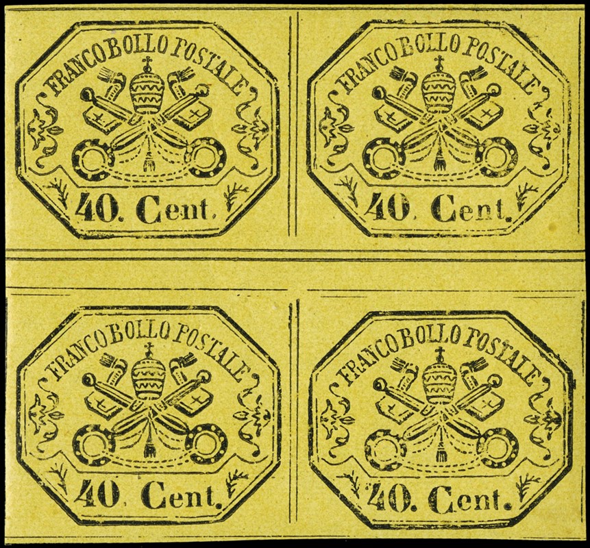 1867 - 2c yellow green, 10c orange vermilion, 40c yellow and 80c lilac rose in BL4, mint. 2c with sheet margin, 40c with horizontal interpane margin, 80c with upper right sheet margin. cert. by Alberto Diena for the 10c (Sassone 13+17+19+20 - as hinged Eu