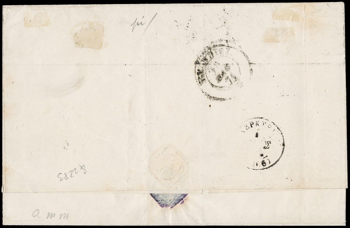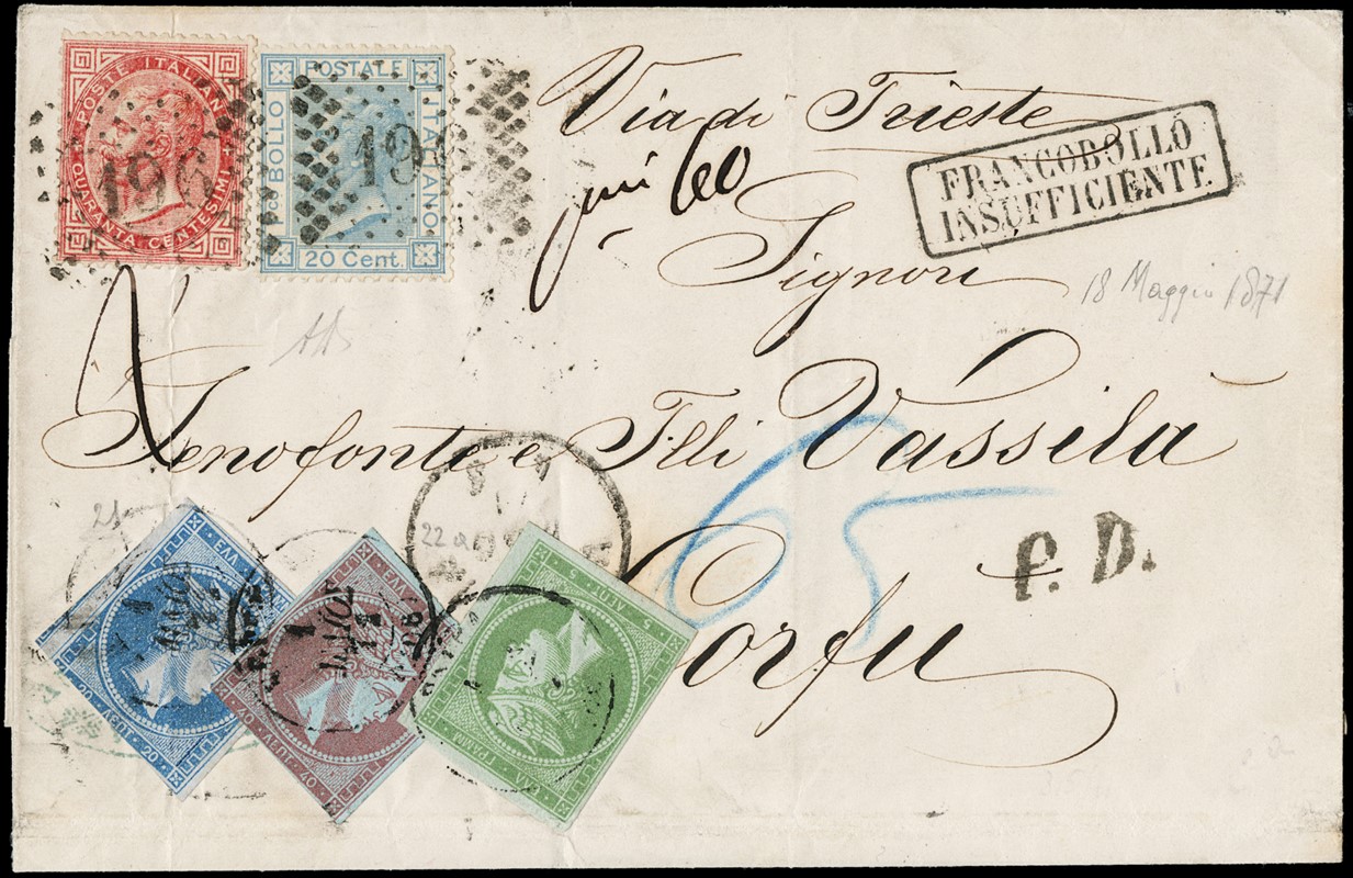 1867 - 40c carmine-red, De La Rue Turin, and 20c blue cancelled with dotted numeral “196' from “VENEZIA' 18 May 1871, to Corfu, via Trieste, with boxed “FRANCOBOLLO INSUFFICIENTE'. Postage due on arrival with Greece 5 lepta green, 20 lepta blue and 40 lepta mauve on blue (5L and 20L slightly cut). Extremely interesting usage, signed A.Diena (Sassone 16+27 - Euro -)
