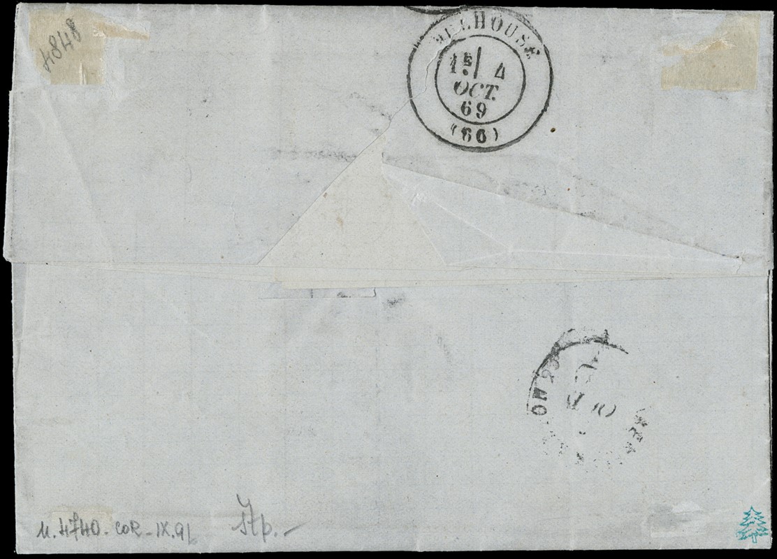 1869 - France: Napoleon 3rd bistre 10c and Lauree Napoleon bistre 10c, from 'GARE D'AVIGNON 3 OCT. 69' to Mulhouse. Interesting 'twin values' mixed franking. Ex Provera, signed Ferchenbauer (Yvert 21+28B - Euro - )