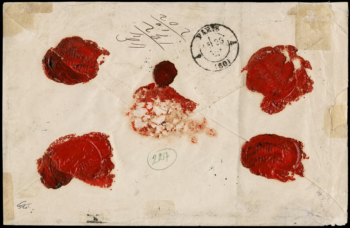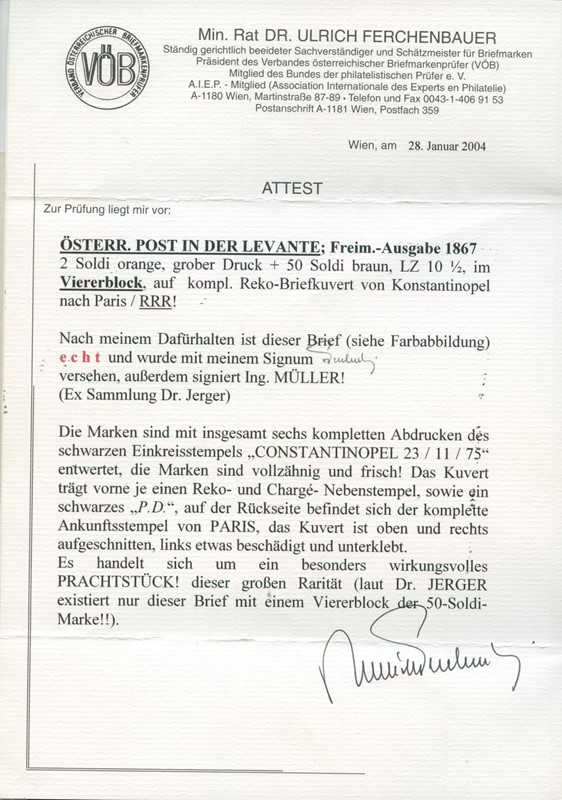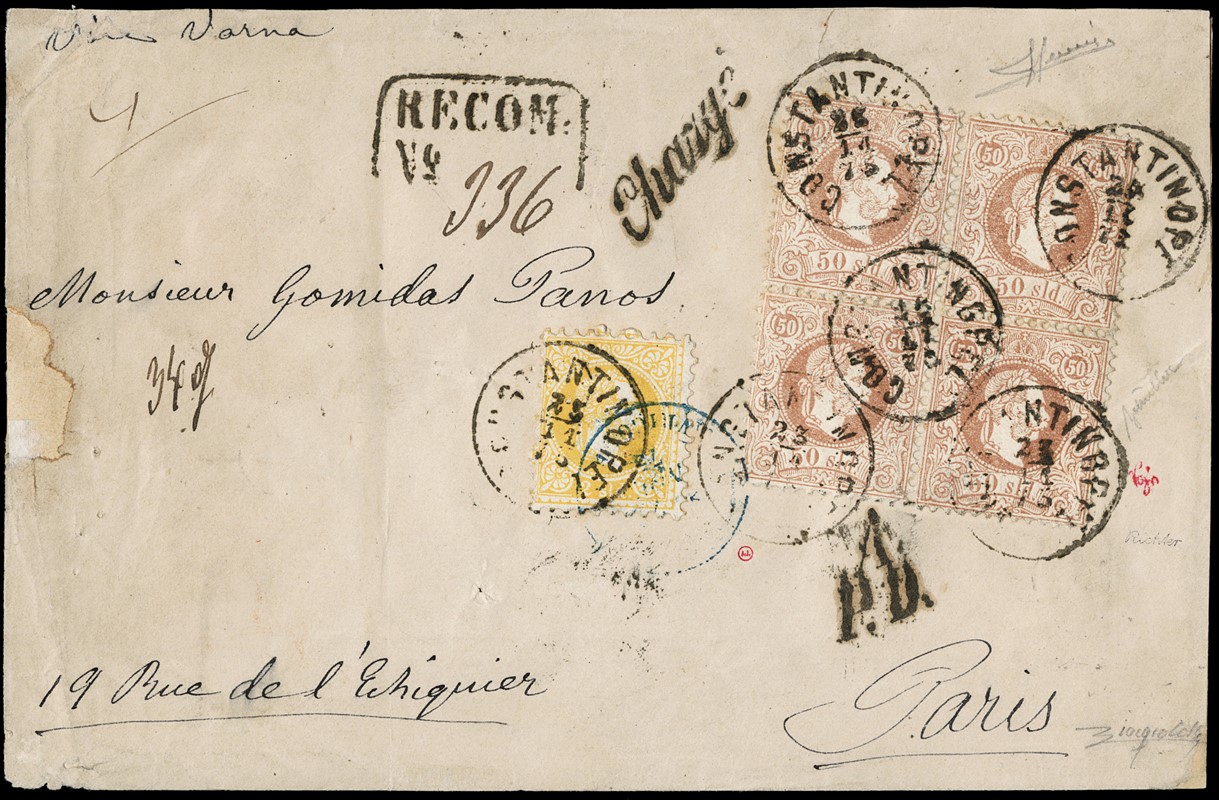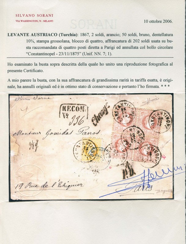 1875 - Austrian Levant: orange 2s and brown 50s perf.10 3/4, BL4, on registered letter from 'COSTANTINOPEL 23/11/75' to Paris. Extremely rare franking of 202 soldi, great rarity of this area. Signed Muller, certs. Ferchenbauer e Sorani (Ferchenbauer 1/I+7/I - Euro - )
