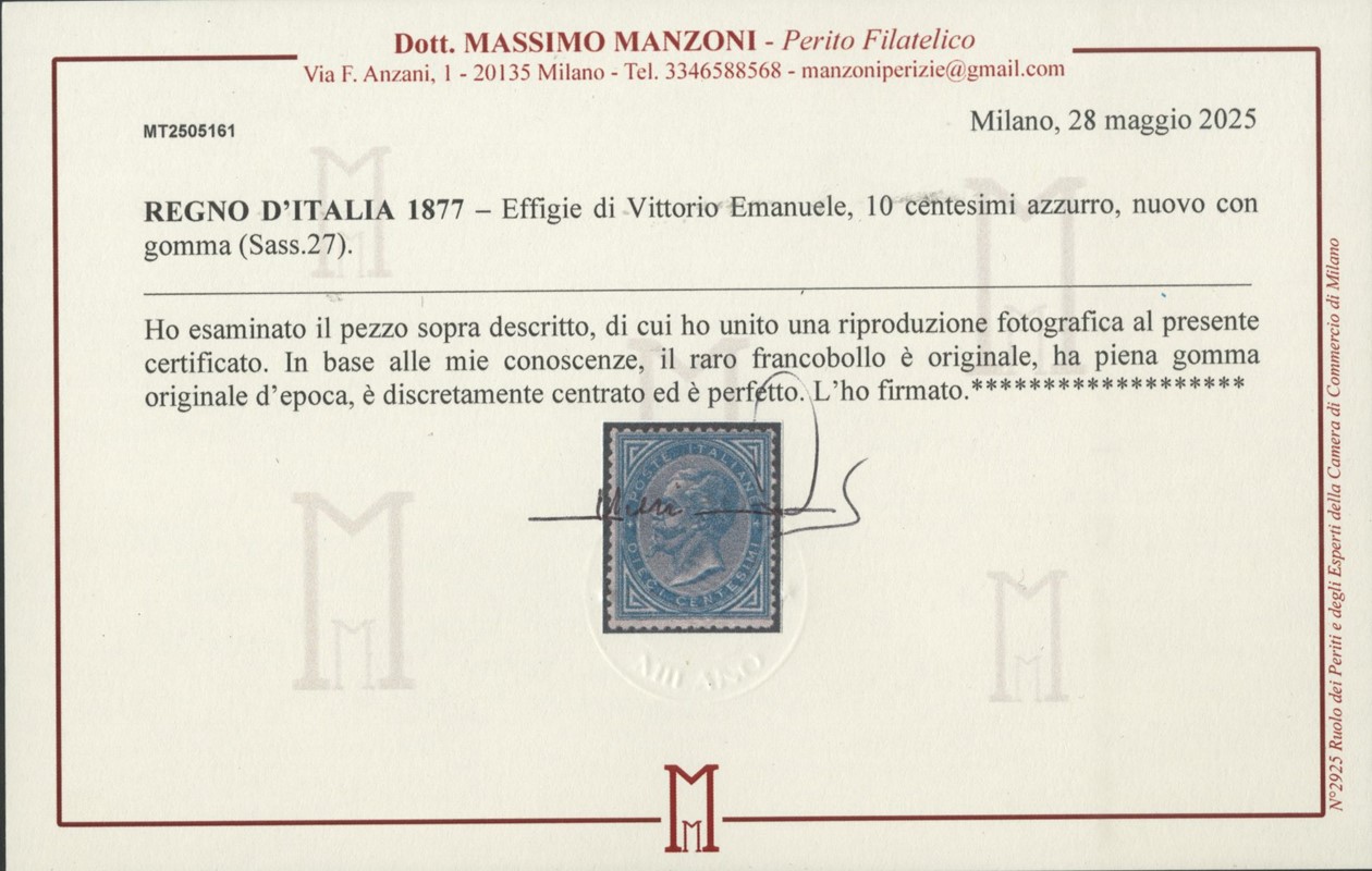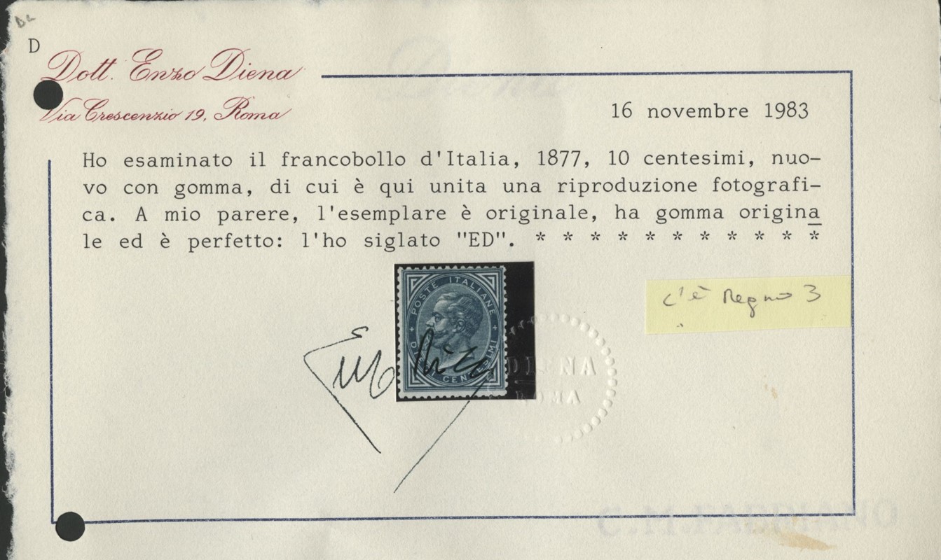 1877 - 10c blue, “inverted colors', fine/fine centering. Cert. E.Diena and Manzoni (Sassone 27 - Euro 12,000)