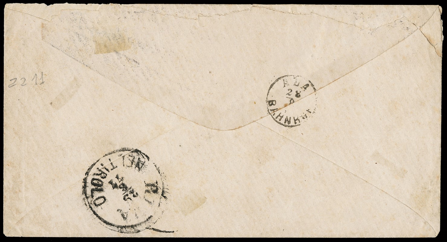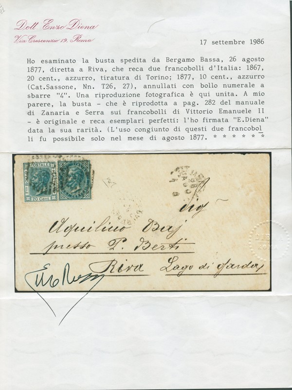 1877 - 20c blue “Bigola' and 10c blue “inverted colors', franking with “twin values' from “BERGAMO BASSA 28 AGO 77' to Riva (Austria). Extremely rare combination, possible only for one month. Splendid. Cert. E.Diena (Sassone T26+27 - Zanaria-Serra Lire 18,000,000)