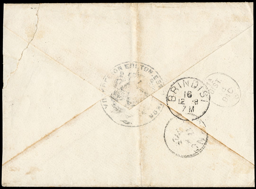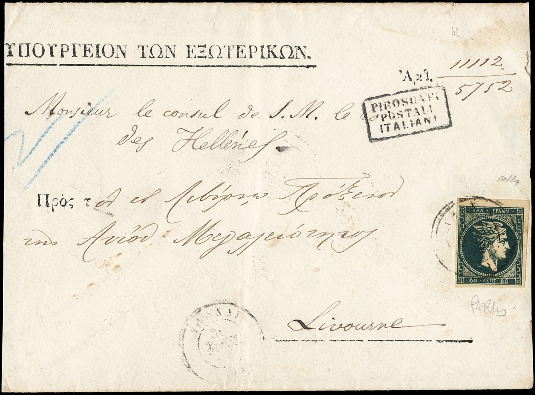 1878 - Large Hermes Heads, Athens printing on cream paper, 60 lepta deep green on Envelope of the Ministry of Foreign Affines (reduced) from 'ATHINAI 30.11.78' (faint) to 'LIVORNO 16.12.78', via BRINDISI, with boxed 'PIROSCAFI POSTALI ITALIANI' on the front. Interesting double weight rate (Yvert 42 - Euro 2.250 / Hellas 46 - Euro 2.200)