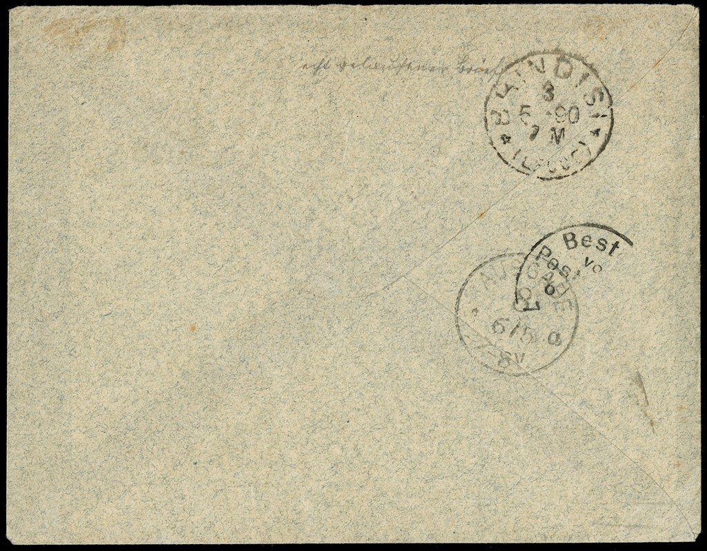 1890 - Large Hermes Heads, Athens fine provisional printing, 2 lepta bistre, pair and a vertically bisected copy (defective), in mixed franking with Athens Small Hermes Head (1st period) 10 lepta red-orange, two copies, from 'ATHINAI 17.04.90' to Berlin 6/5, via BRINDISI 3.5.90. Philatelic correspondence of Sokolis (Greek stamp dealer), very interesting (Yvert 9+80 / Hellas 10II+75)