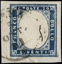 1855 - 20c milky bright cobalt, 4th issue, cancelled 'R. POSTA MIL.E SARDA 27 DIC 55' of the Crimean expedition, [..]