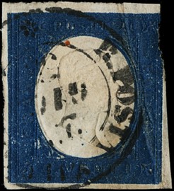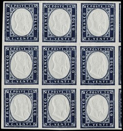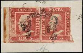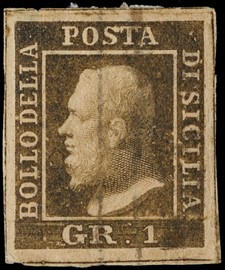1859 – 1gr rusty brown (Naples), 1st plate, mint with large margins. Very slight thinning at upper left, nevertheless [..]