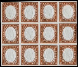 1861 - 3 Lire bright copper, block of 12 with 10 stamps never hinged. Rare and very fresh. Signed E.Diena and [..]