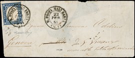 1855 - 20c greyish sky-blue, cancelled 'R. POSTA MILITARE SARDA (N.1) 22 FEB. 61', sent by a soldier from Gaeta [..]