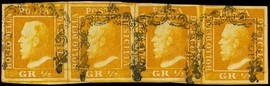 1859 - 1/2 gr dark orange, 1st plate,Naples, horizontal ST4 (pos.63/66). Splendid and rare. Signed Mezzadri, cert. [..]