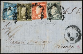 1859 - 1gr olive green, 3rd plate, 2gr light blue, 3rd plate, 5gr bright vermilion, 2nd plate, and 20gr slate [..]