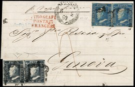 1859 - 2gr deep cobalt blue, 1st plate, pair, and 20gr dark slate, pair, from 'MESSINA 6 -2 60' to Genoa, with [..]