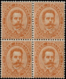 1879 - Umberto I, 20c orange, block of four, very, 1879