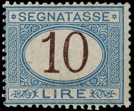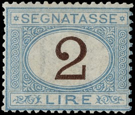 1870 - Postage-due 2L blue light and brown, fine centering. Sign. Fiecchi, Em. and A.Diena, cert. E.Diena and [..]