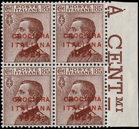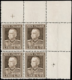 1929 - 1.75L brown, perf. 133/4, block of four with upper right corner margin, MNH, fine/good centring. Signed [..]