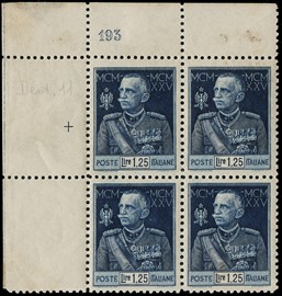 1926 - Giubileo del Re, 1.25L blue, perf. 11, block of four with upper left corner margin and control number '193', [..]