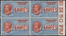 1922 - Express, 60c on 50c red, block of four with corner margin, fine centred (Sassone E6 – Euro 1,250+)