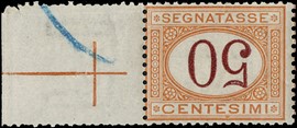 1870 - 50c ochre and carmine, inverted numeral variety, full sheet margin at left with registration cross, MNH. [..]