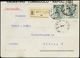 1924 – Winged Victory, 1L on 15c slate, overprinted pair on registered cover from 'NAPOLI 5/4/24' to Vienna. Ex [..]