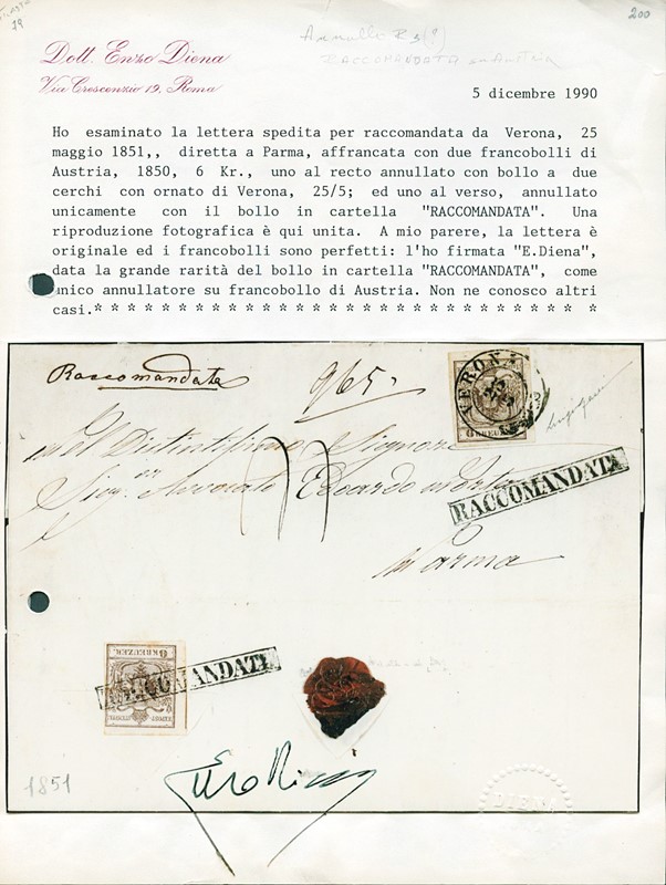 1850 - Austria 6kr brown, type I, hand paper on registered cover from 'VERONA 25/5' (51 - 2CO ornato) and 6kr brown cancelled 'RACCOMANDATA' in framed handstamp, not listed in Sassone. Cert. E.Diena: 'I have signed it given the great rarity of the framed ‘RACCOMANDATA’ handstamp used as sole cancellation on Austrian stamp. I know of no other examples.'