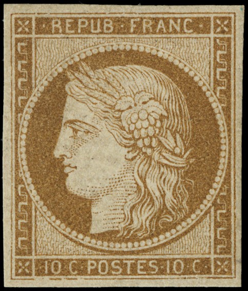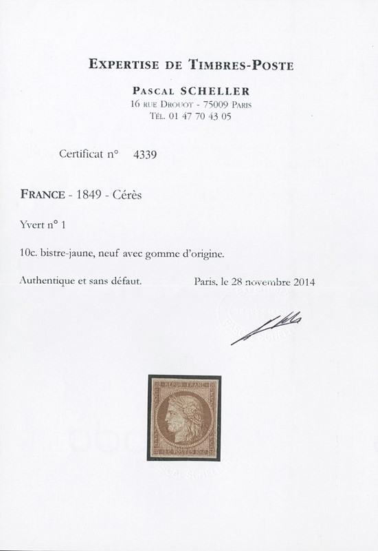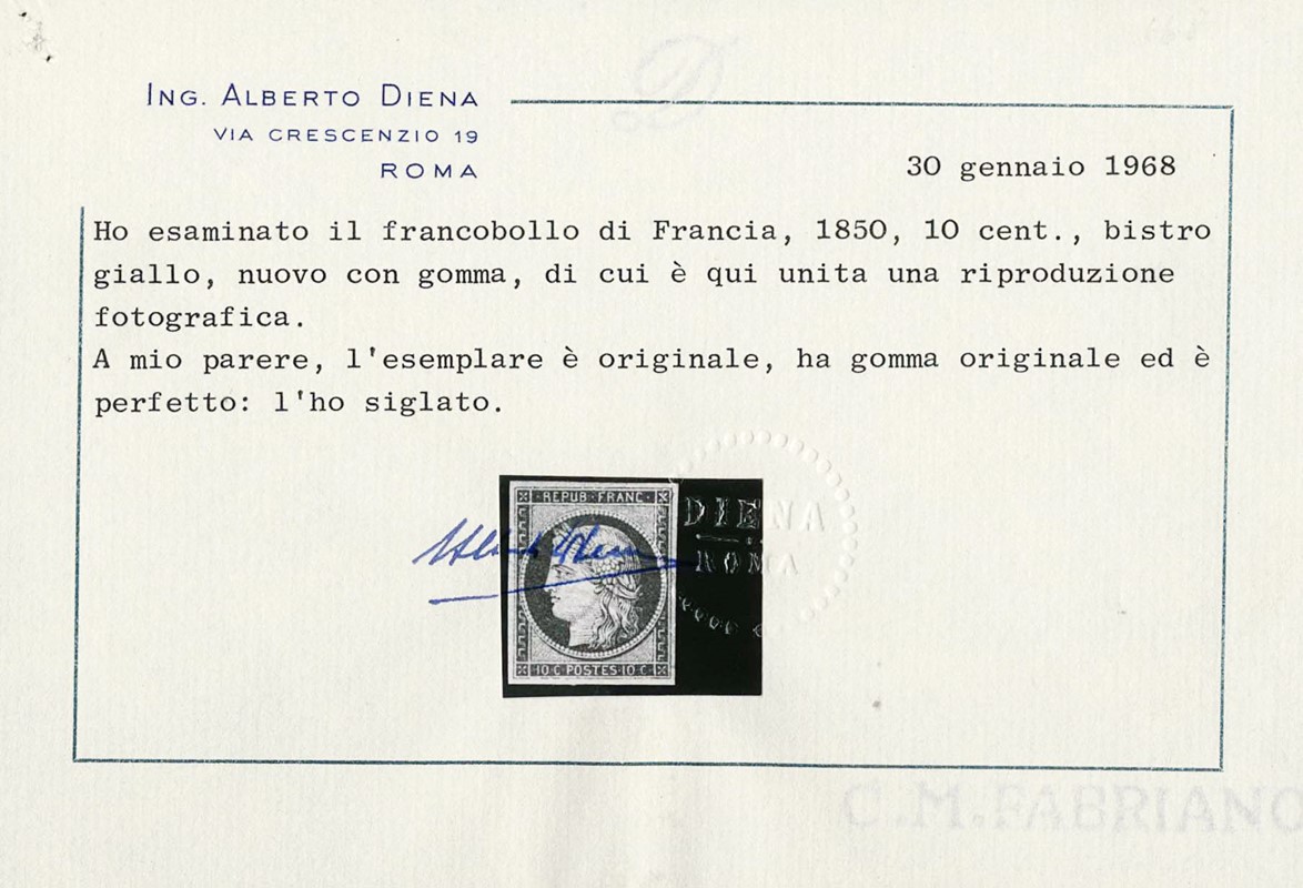 1850 - France: Ceres 10c bistre-yellow, mint with full original gum, very lightly hinged. Certs. Scheller and A.Diena (Yvert 1 - Euro 3,200)