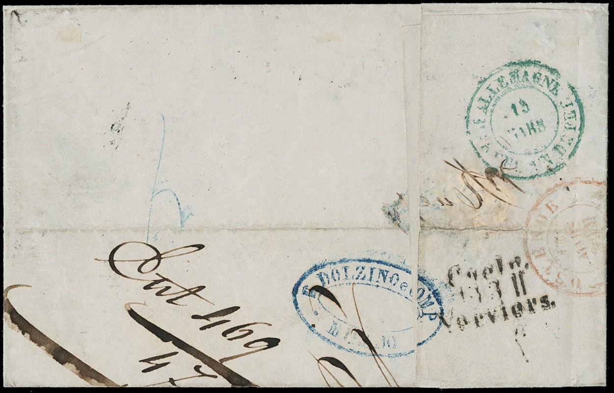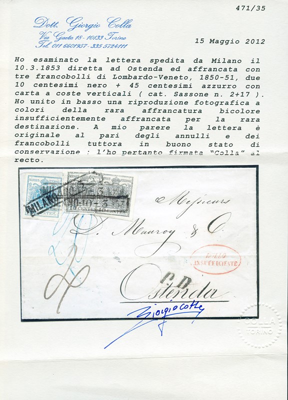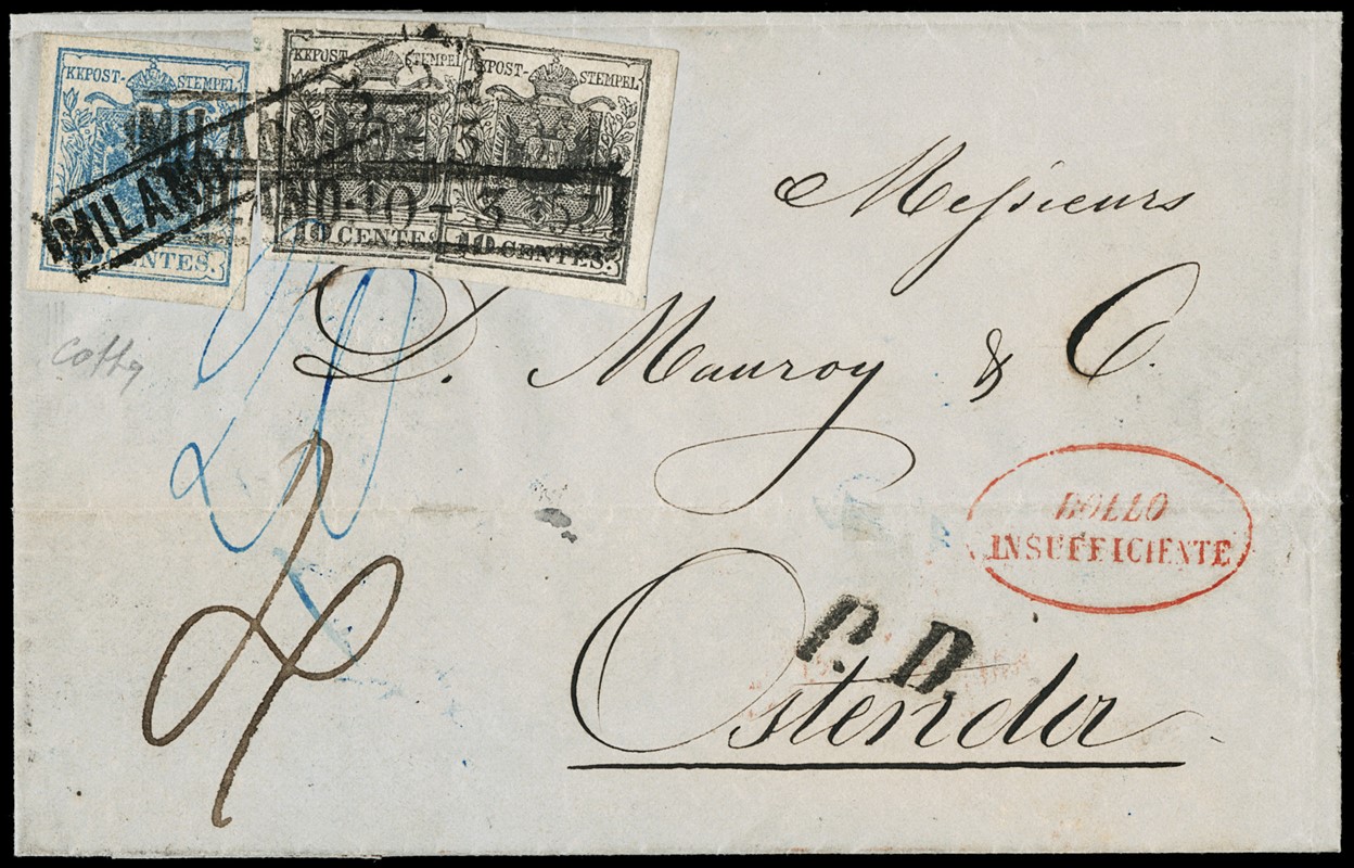 1850 - Lombardy Venetia, 1st issue, 10c black, hand paper, two copies (one just touched in one place) and 45c blue, type I, vertically ribbed paper, from 'MILANO 10-3-53' (R53) to Ostend (Belgium), with tax marking and red handstamp 'INSUFFICIENT POSTAGE'. Very rare postal item both for the franking combination and the destination. Cert. Colla (Sassone 2+17 – Euro –)